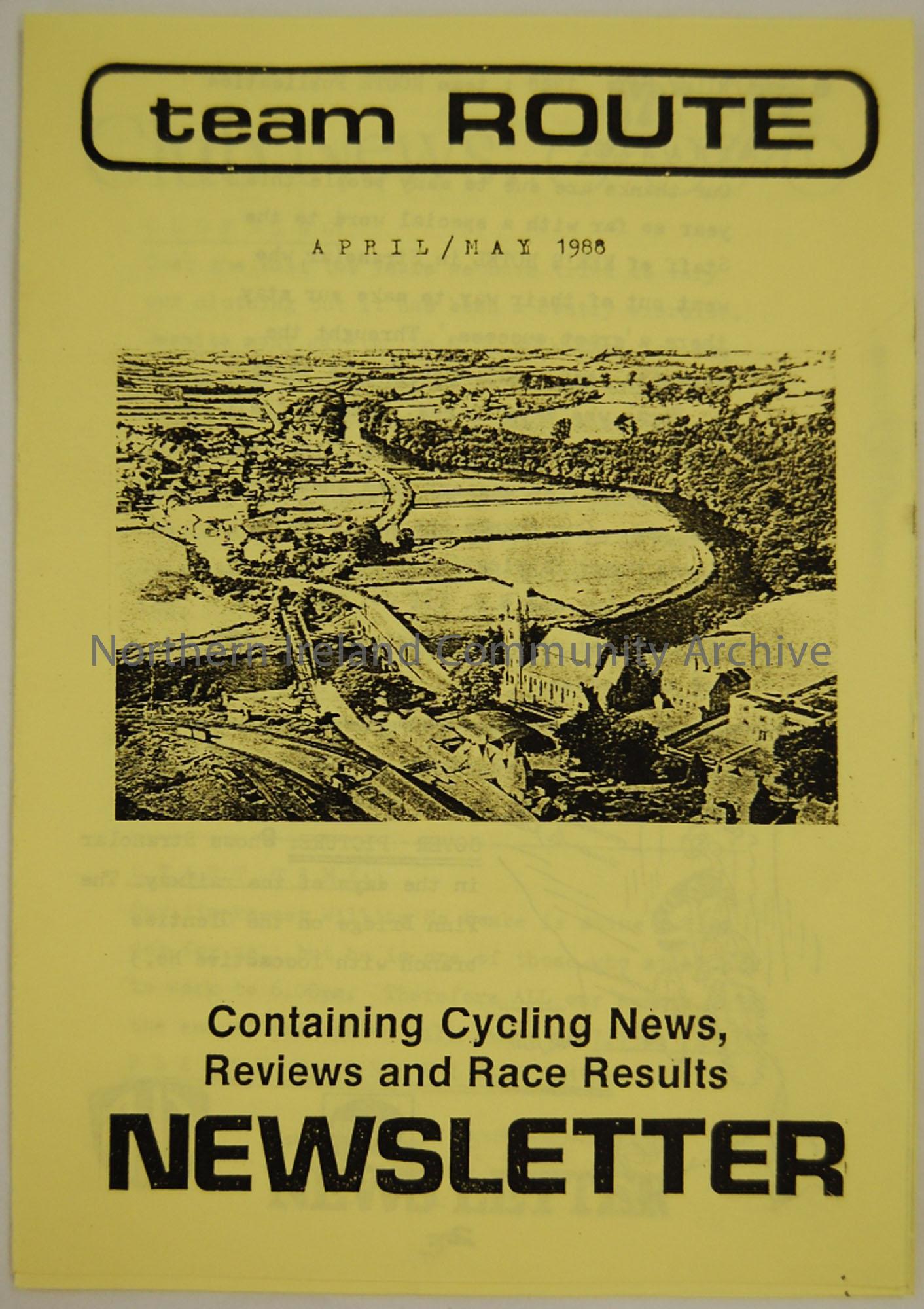 Produced copy of the Team Route Newsletter April/May 1988. Magazine of the Ballymoney and district cycle club detailing recent club news, events and articles.