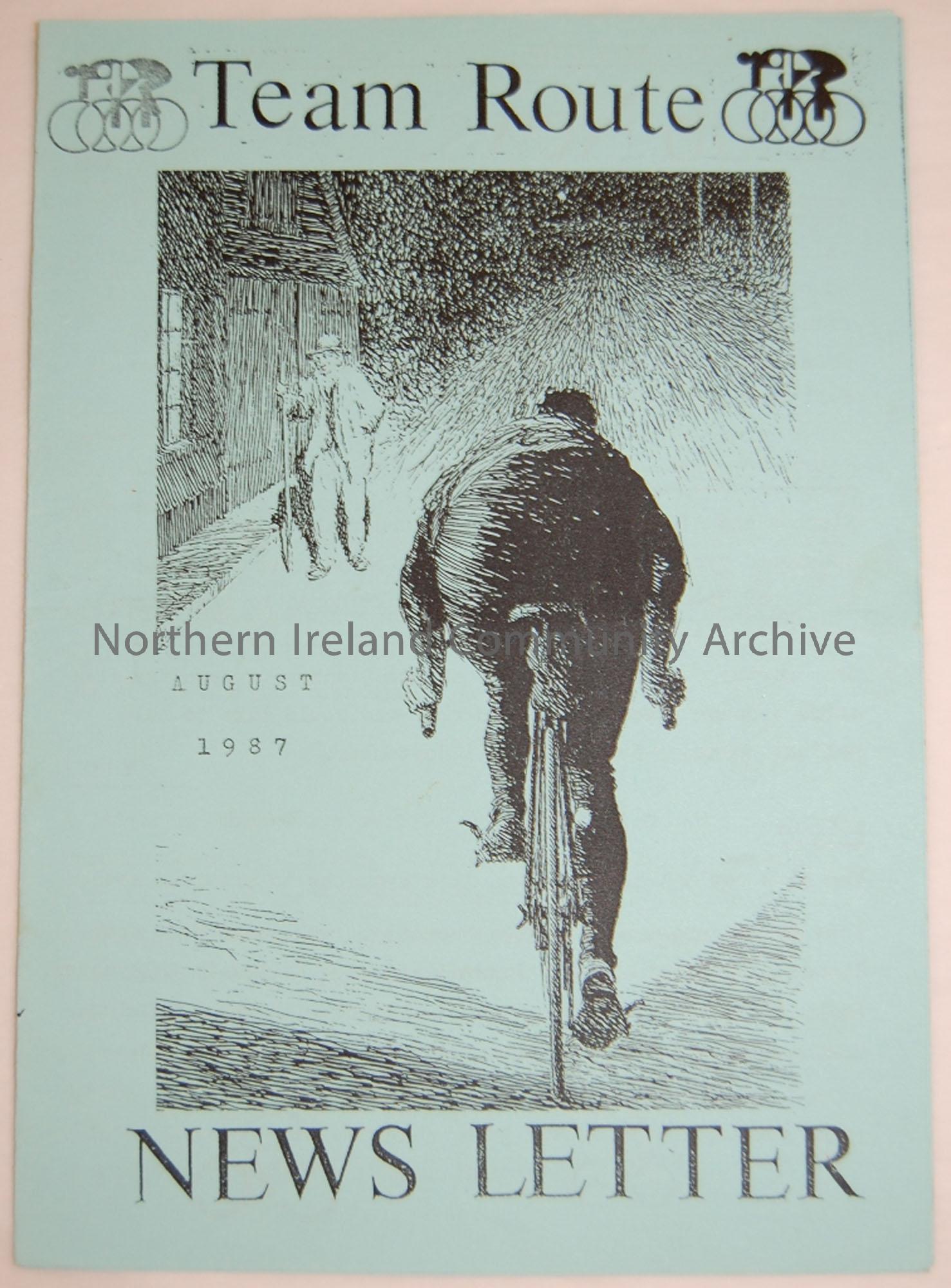 Produced copy of the Team Route Newsletter August 1987. Magazine of the Ballymoney and district cycle club containing cycling news, reviews and race results.