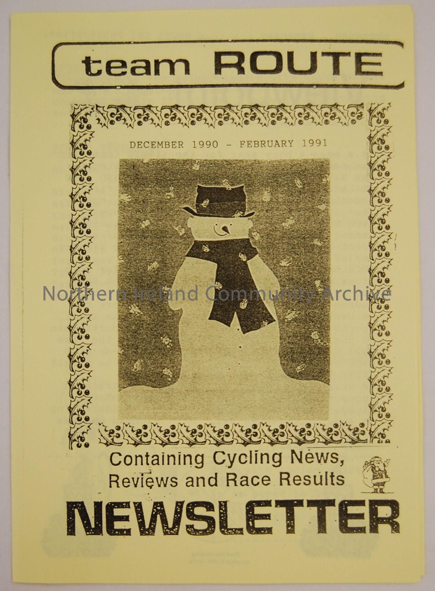 Produced copy of the Team Route Newsletter December/ February 1990/1991. Magazine of the Ballymoney and district cycle club containing cycling news, reviews and race results.