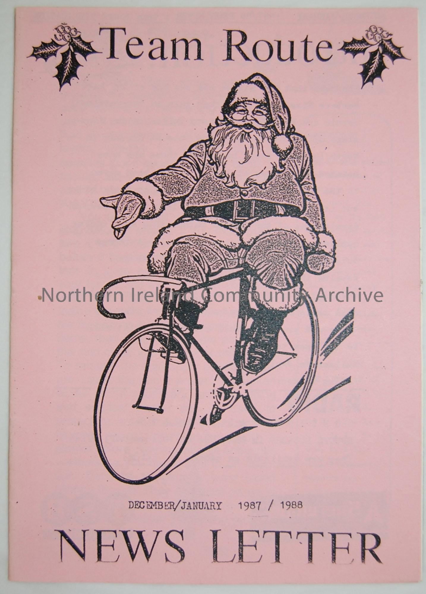Produced copy of the Team Route Newsletter December/January 1987/88. Magazine of the Ballymoney and district cycle club detailing recent club news, events and articles. Includes articles on health and fitness and youth hostels.