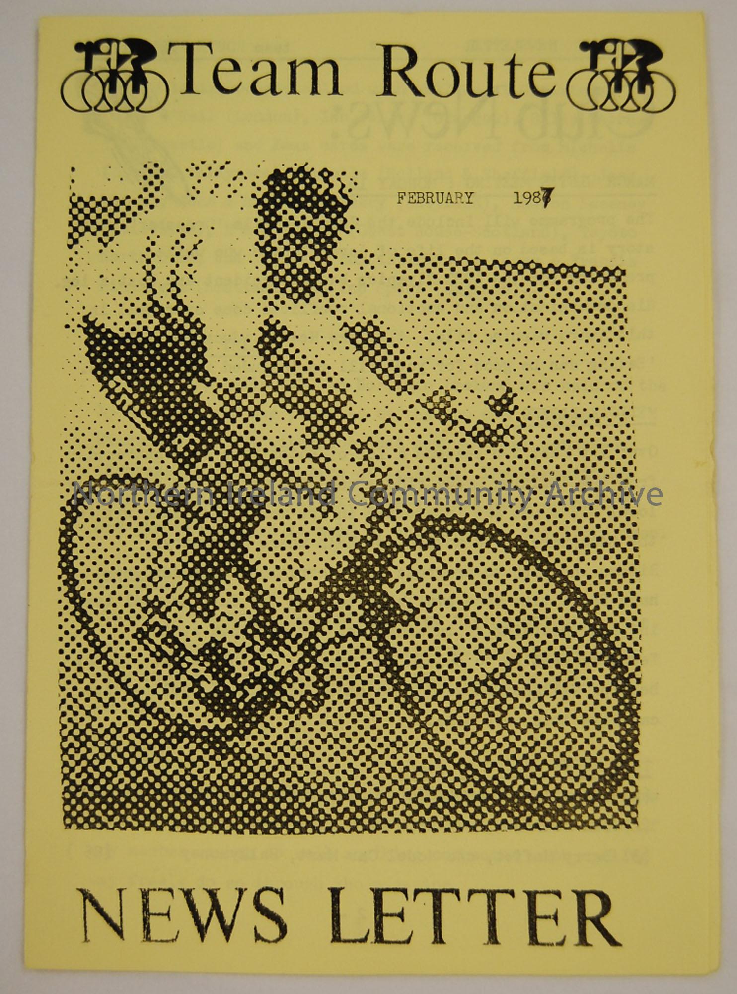 Produced copy of the Team Route Newsletter February 1987. Magazine of the Ballymoney and district cycle club containing cycling news, reviews and race results.