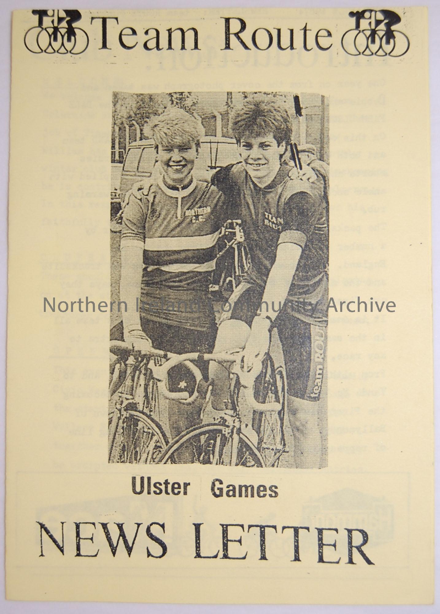 Produced copy of the Team Route Newsletter June/July 1987. Magazine of the Ballymoney and district cycle club containing cycling news, reviews and race results.