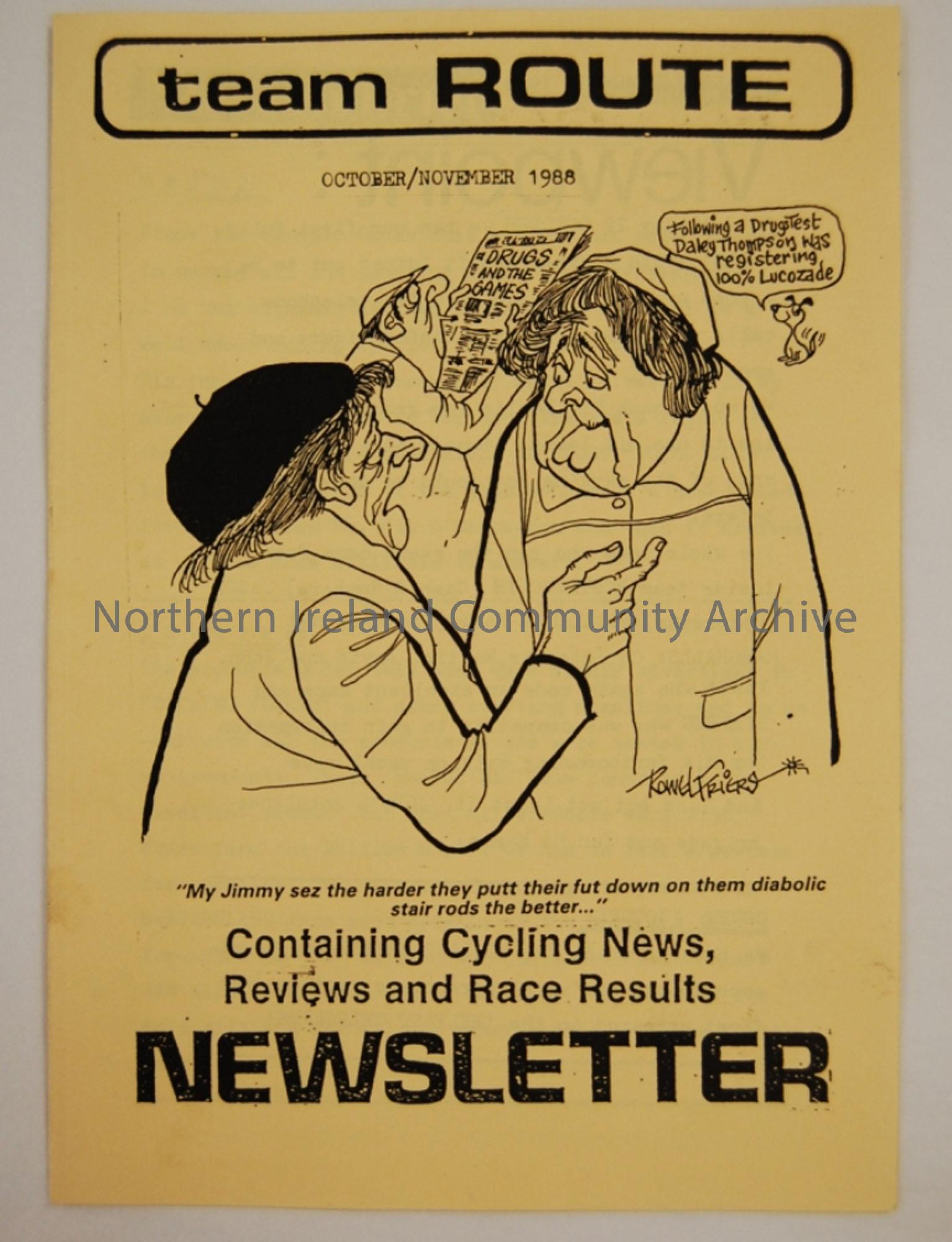 Produced copy of the Team Route Newsletter October/November 1988. Magazine of the Ballymoney and district cycle club containing cycling news, reviews and race results.