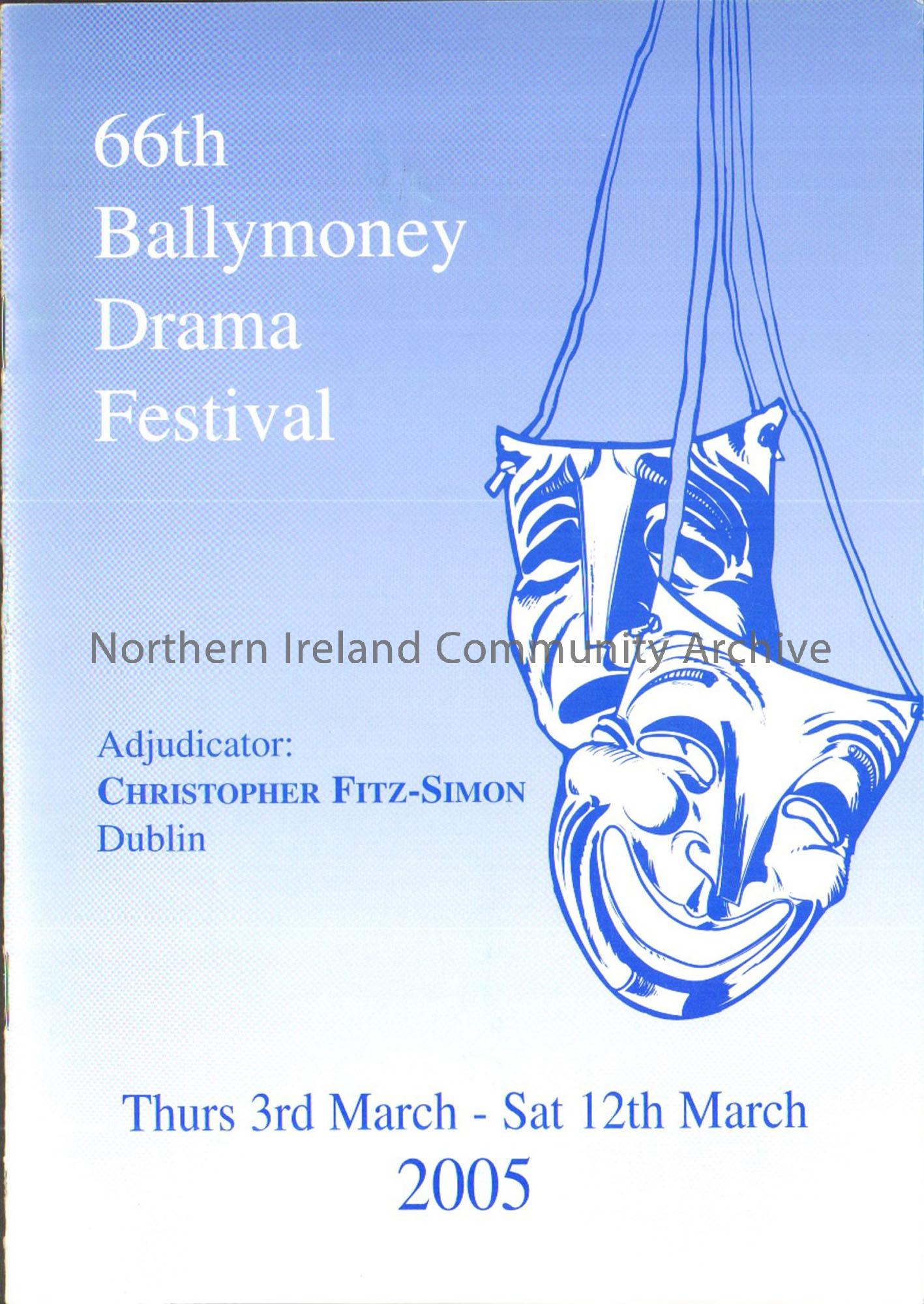 Programme advertising the 66th Ballymoney Drama Festival in 2005. Light blue booklet with white and blue writing and the comedy/tragedy theatre masks …