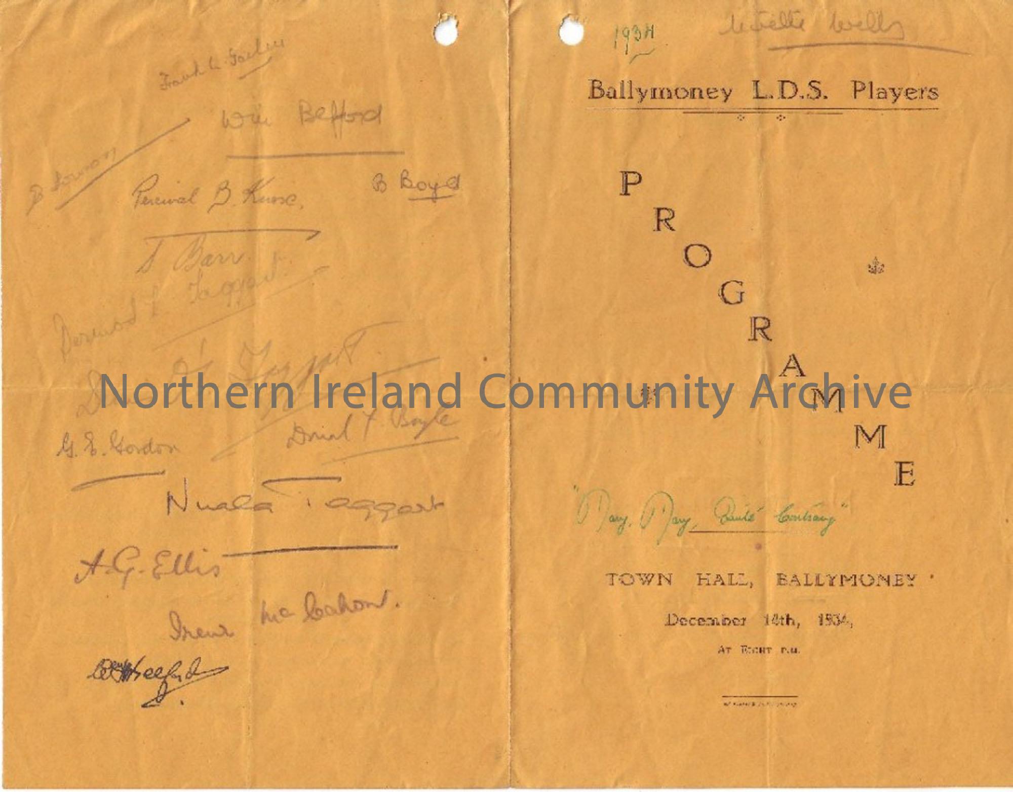 Programme Ballymoney Literary and Debating Society, December 14th, 1934. Signed by members of the cast