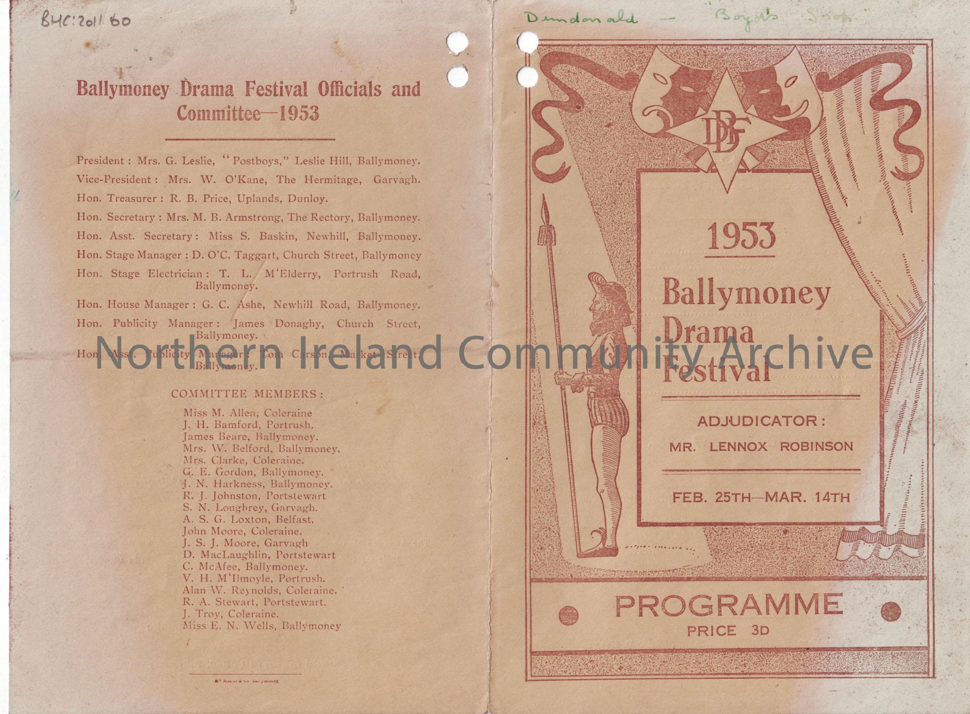 Programme for Ballymoney Drama Festival 1953, Feb 25th- Marc 14th