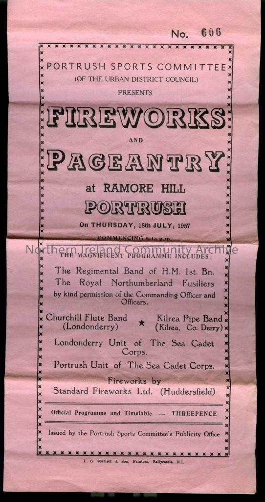 programme for Portrush Sports Committe Fireworks and Pageantry at Ramore Hill Portrush, 18th July, 1957. Programme includes Regimental Band of HM 1st Bn., The Royal Northumberland Fusiliers and local flute and pipe bands.