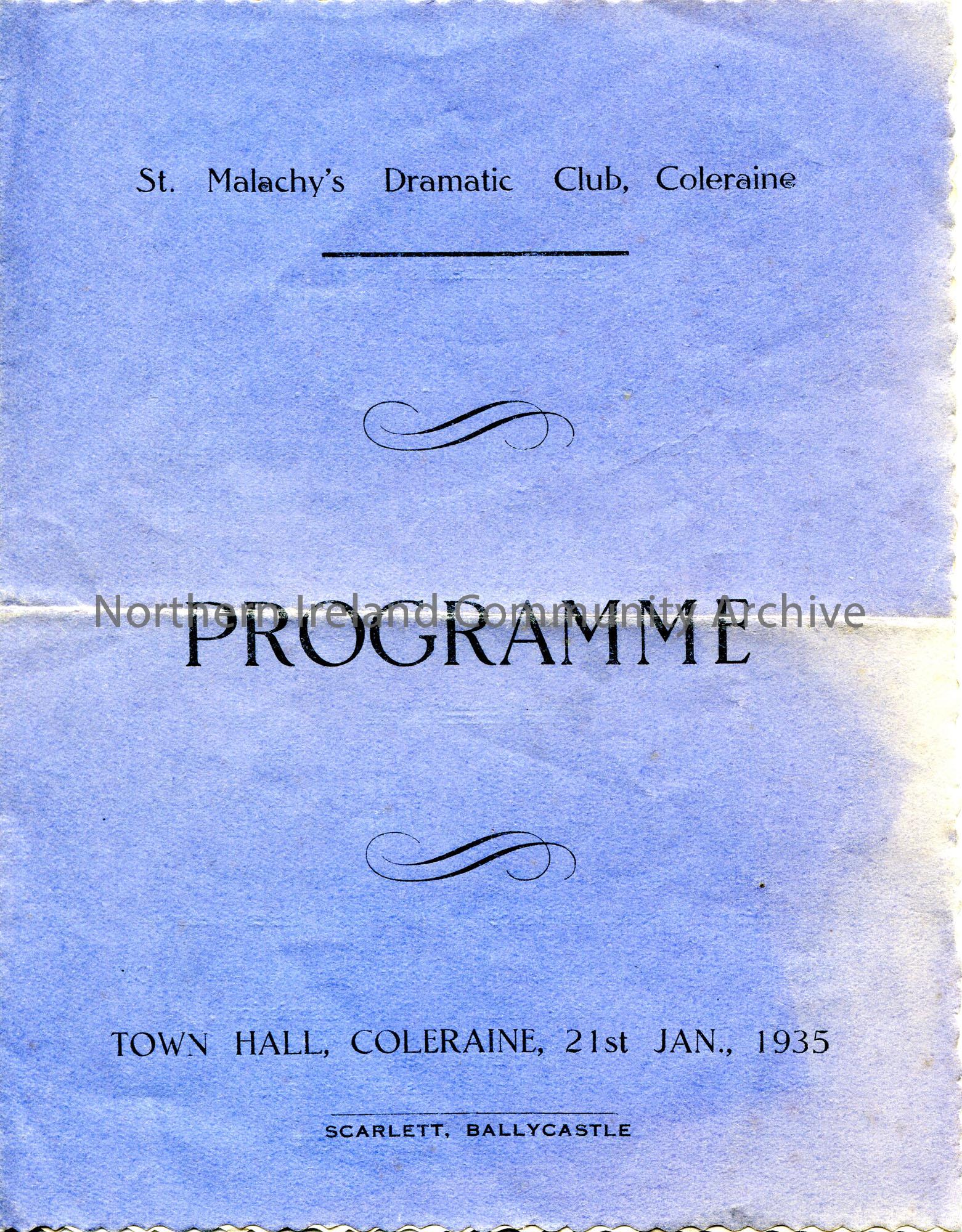 Programme leaflet for St. Malachy’s Dramatic Club, Coleraine. Town Hall, Coleraine, 21st January, 1935. Entry for an Irish Ceilidh directed by Mr Sam …