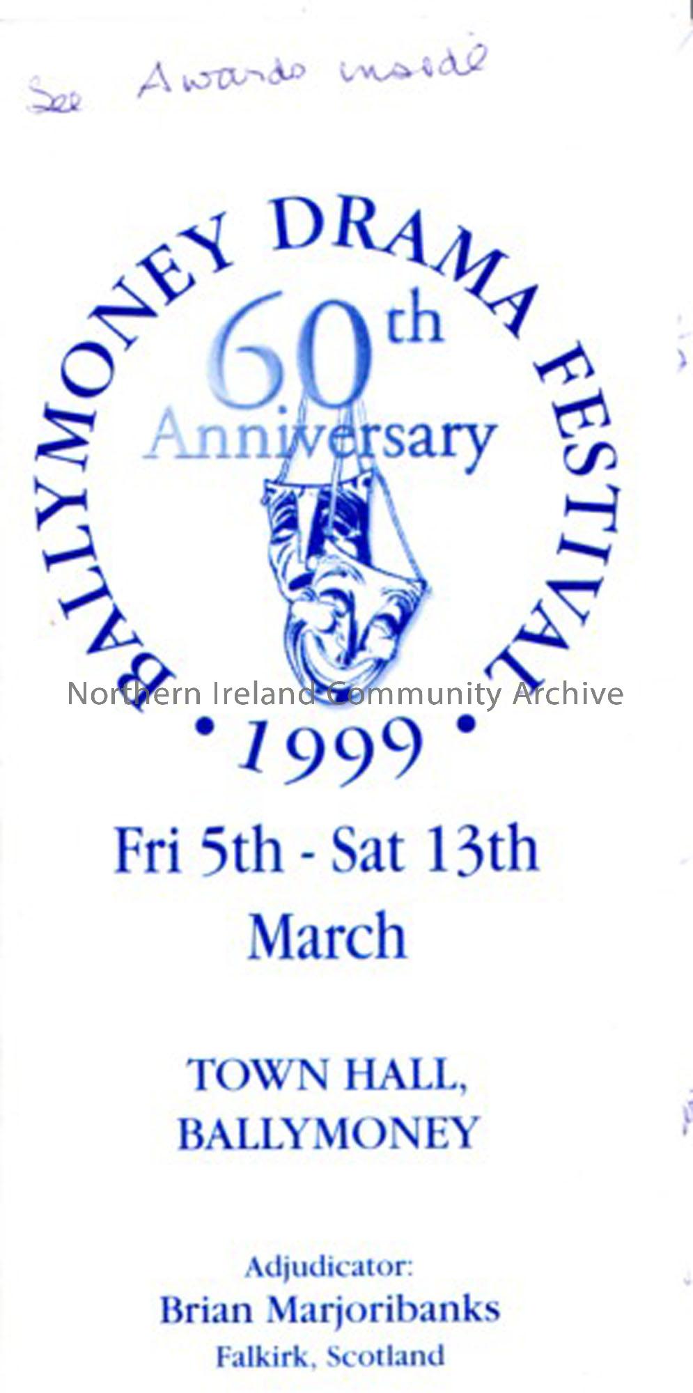 Programme of 57th Ballymoney Drama Festival,1999 5th to 13th March, town hall Ballymoney, adjudicator Brian Marjoribanks