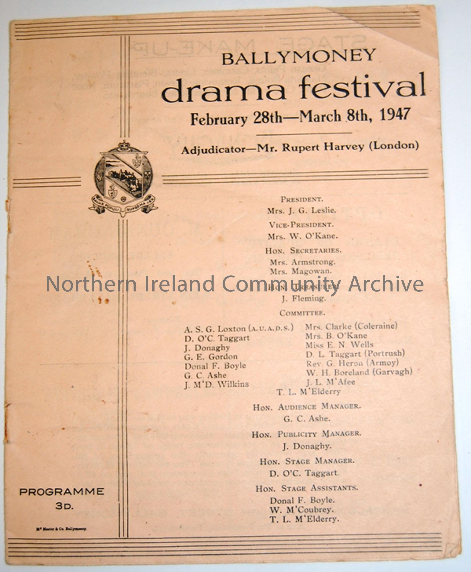 Programme of Ballymoney Drama Festival, February 28th-March 8th, 1947. Adjudicator- Mr. Rupert Harvey (London)