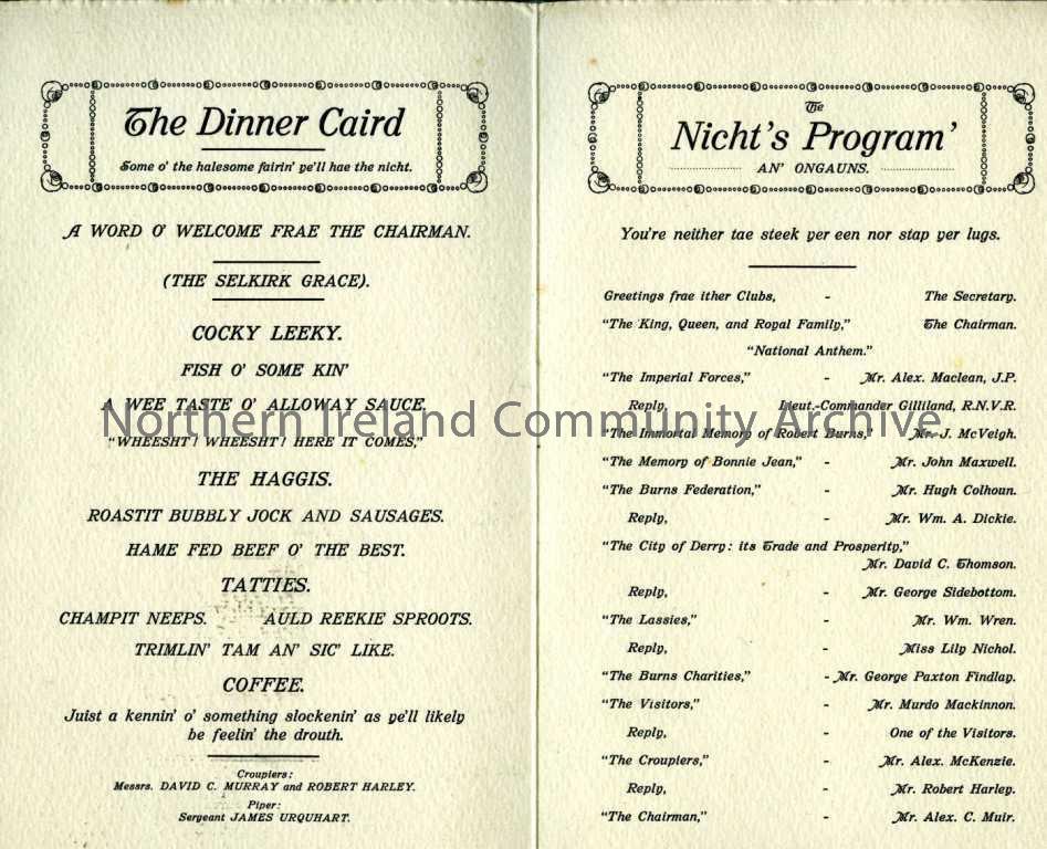 Programme of dinner menu and evenings events for Burns Supper on 24th January 1930.