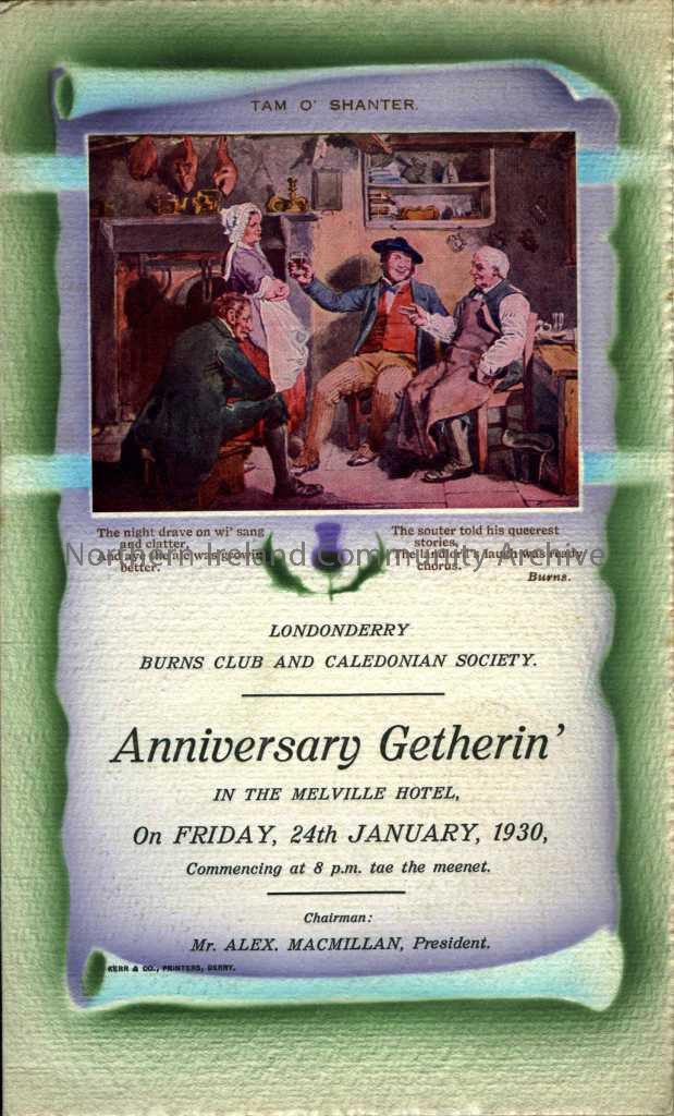 Programme of dinner menu and evenings events for Burns Supper on 24th January 1930.