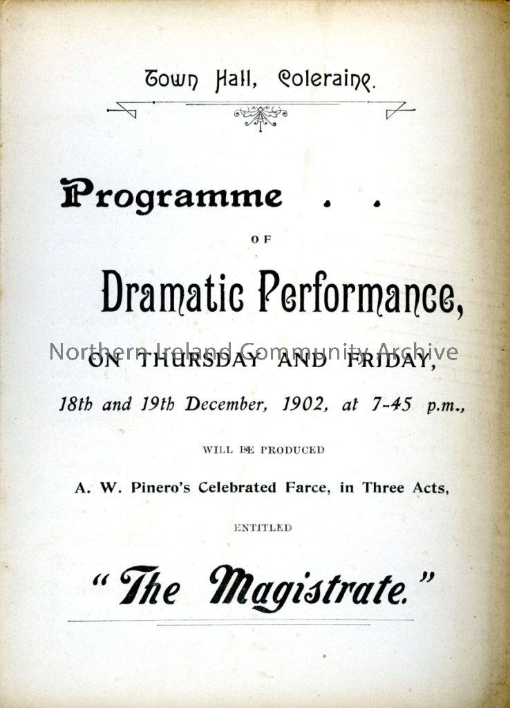 Programme of 'Dramatic Performance, on Thursday and Friday, 18th and 19th December, 1902, at 7~45 p.m., will be produced A.W. Pinero's Celebrated Farce, in Three Acts, Entitled "The Magistrate." Held in the Town Hall, Coleraine.