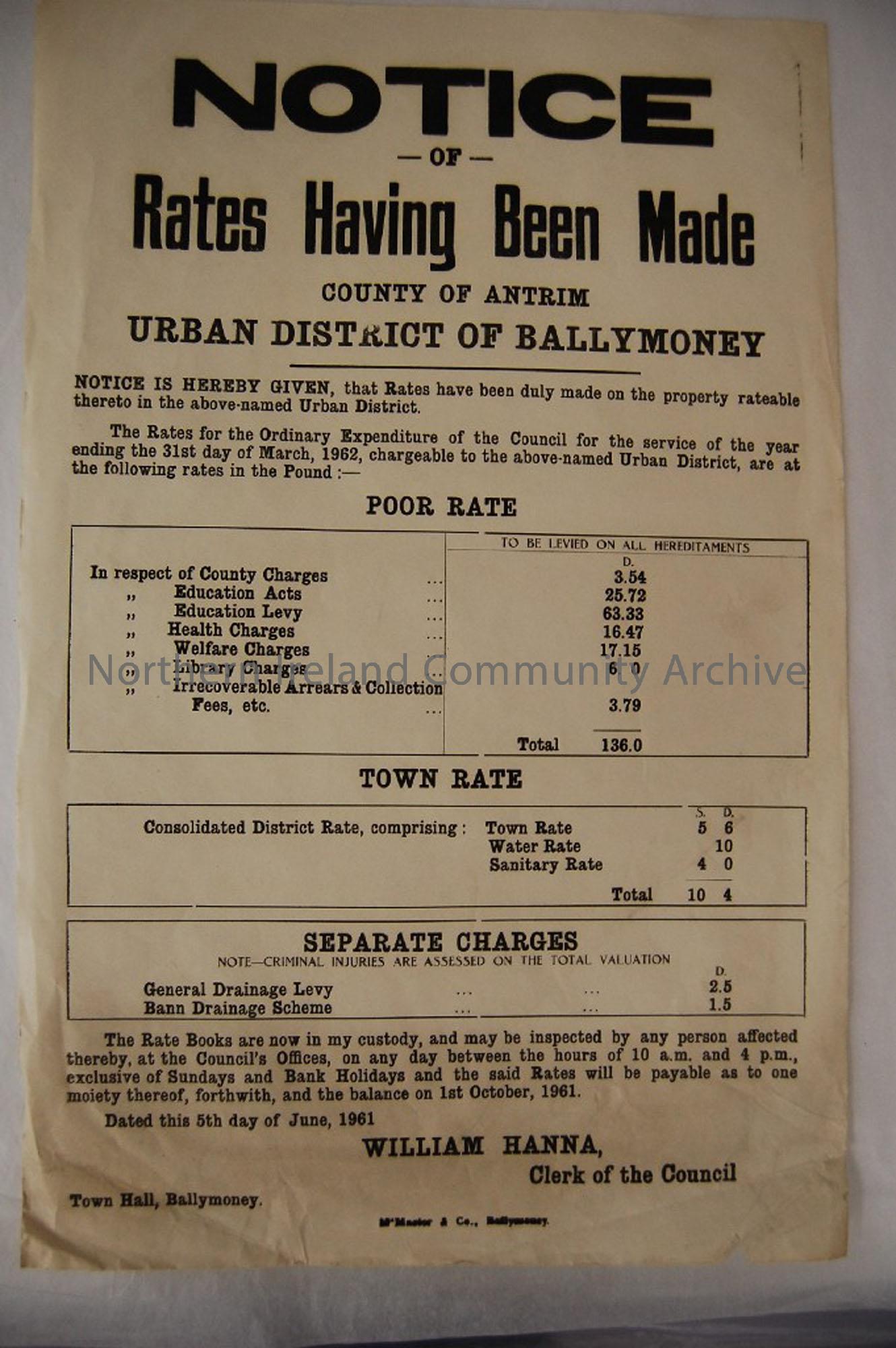 Public Notice announcing the Rates for the expenditure of Ballymoney Urban District Council for the service of the year ending 31st March 1962. Issued by Town Clerk William Hanna 5th June 1961