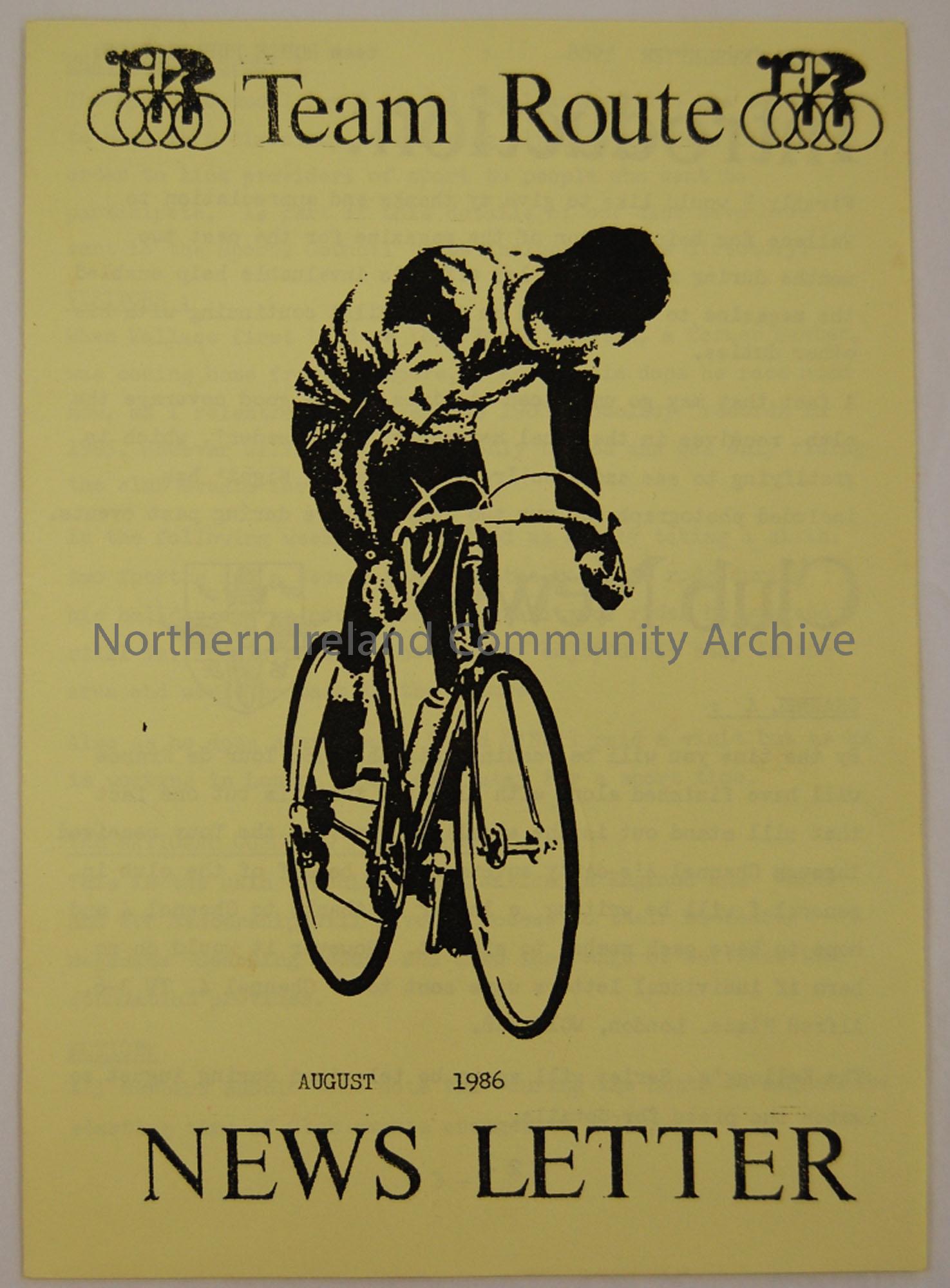 Published copy of the Team Route Newsletter. August 1986. Magazine of the Ballymoney and district cycle club containing cycling news, reviews and race results.