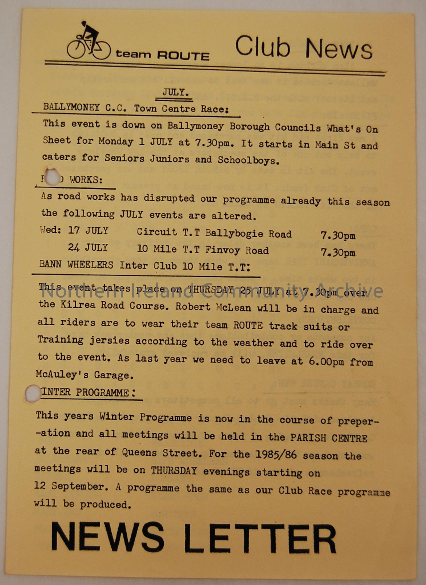 Published copy of the Team Route Newsletter. July 1985. Magazine of the Ballymoney and district cycle club containing cycling news, reviews and race results.