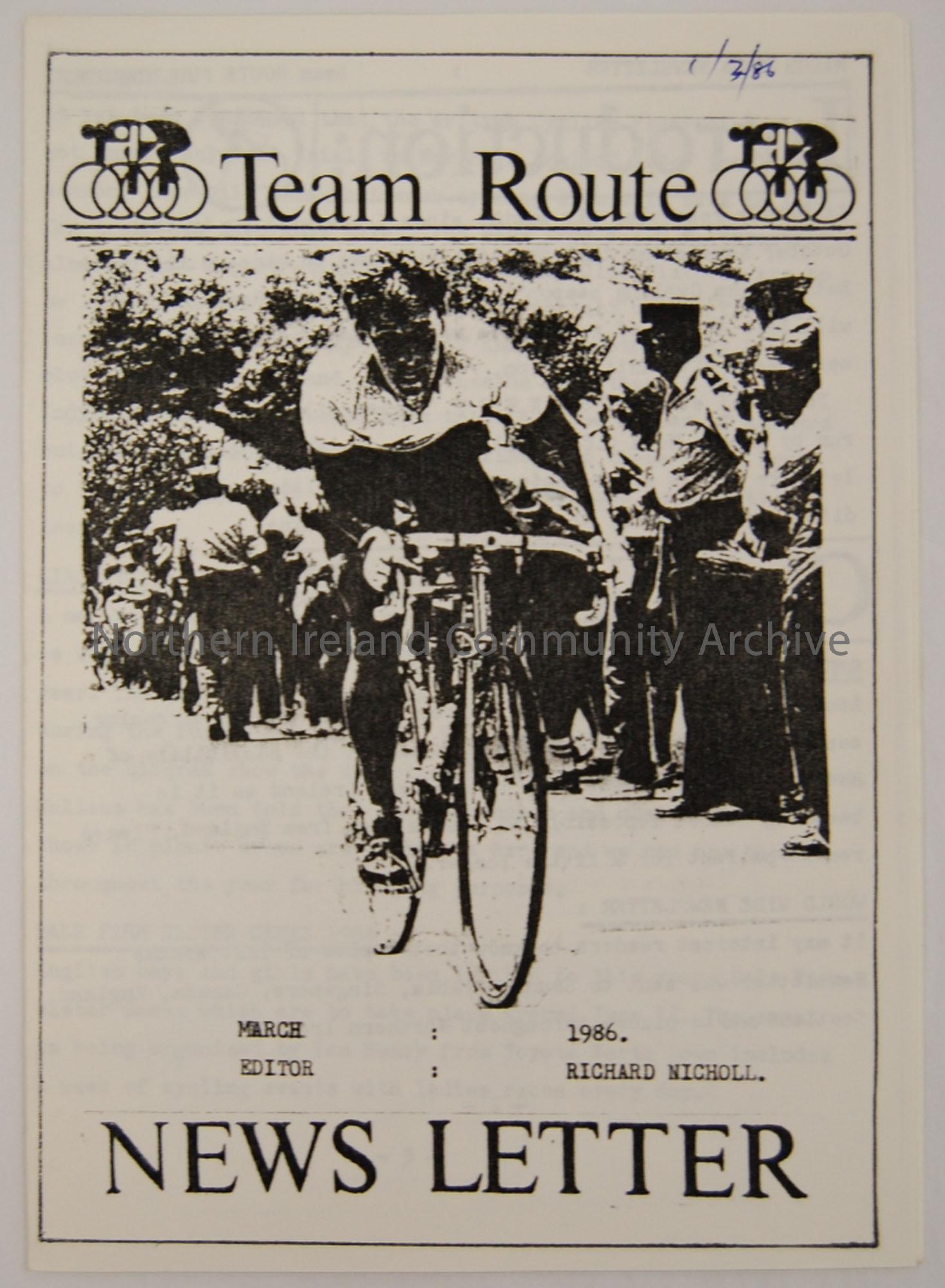 Published copy of the Team Route Newsletter. March 1986. Magazine of the Ballymoney and district cycle club containing cycling news, reviews and race results.