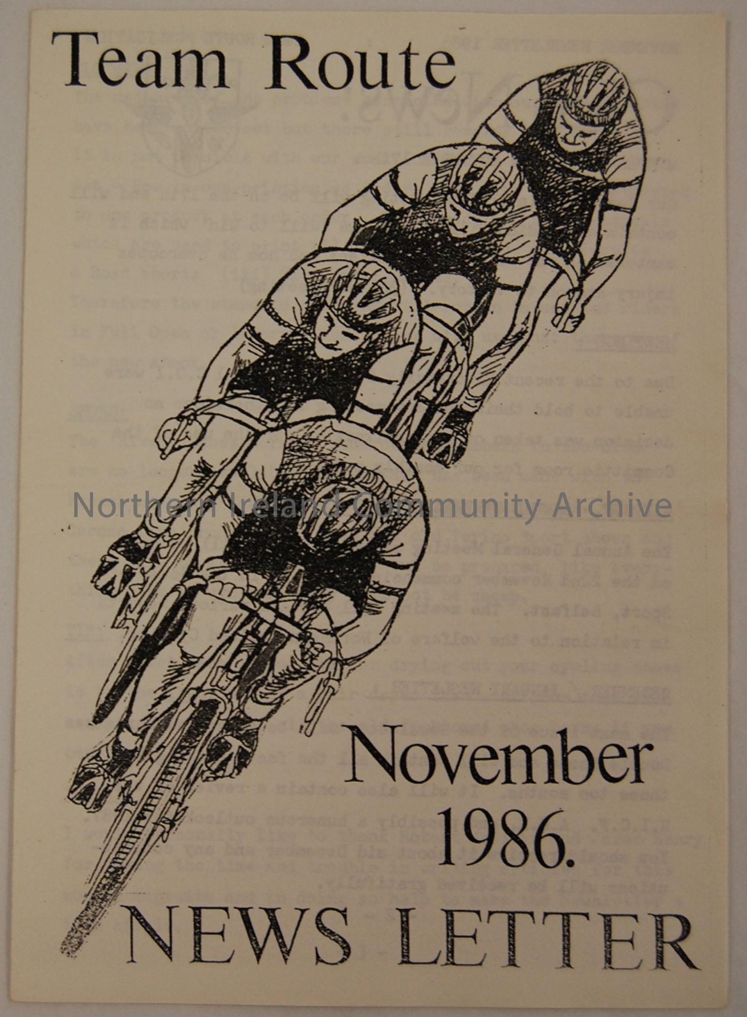 Published copy of the Team Route Newsletter. November 1986. Magazine of the Ballymoney and district cycle club containing cycling news, reviews and race results.
