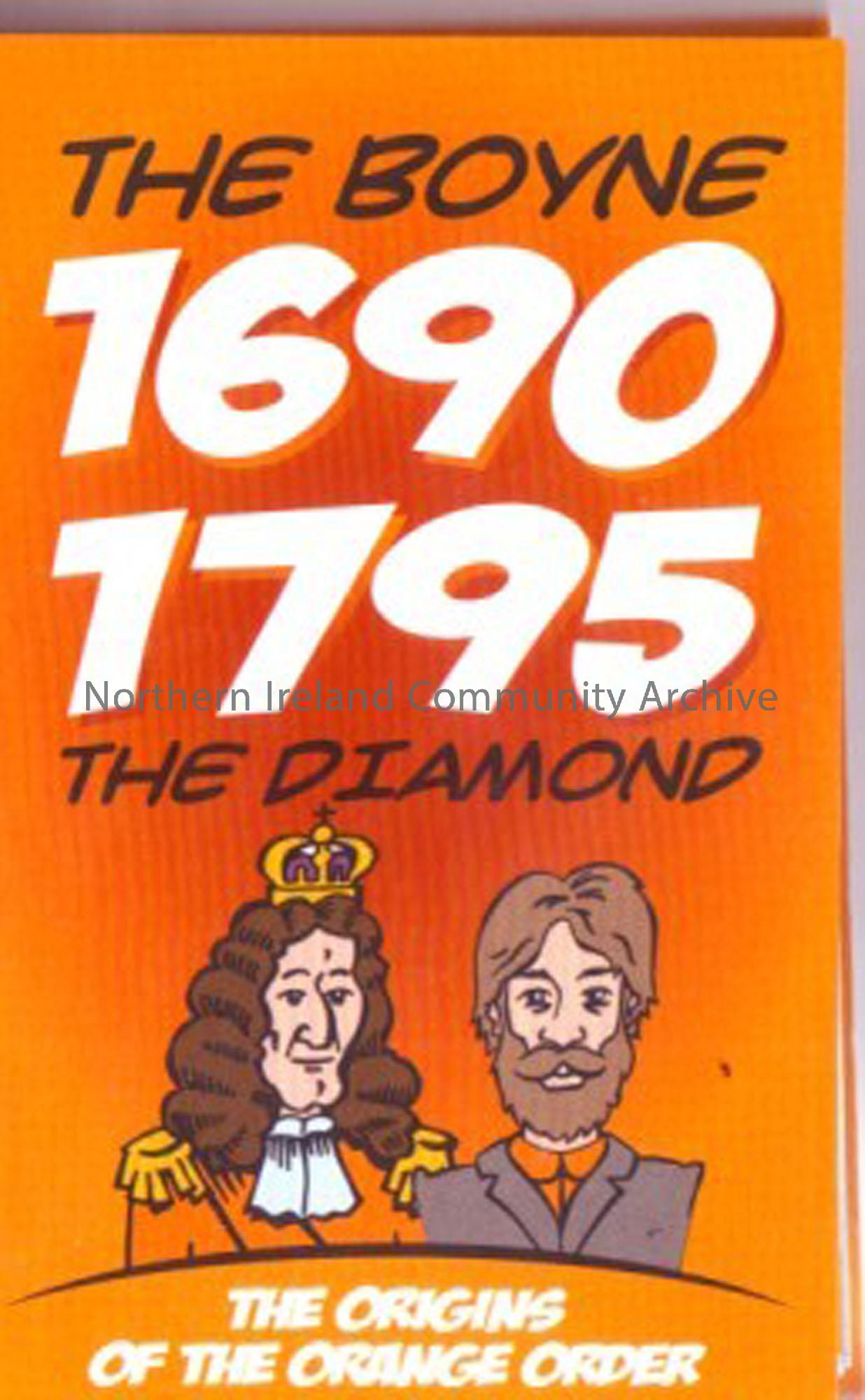 pull out leaflet describing the origins of the Orange order- 2007. Designed for children, this leaflet is a pilot programme to see how well it will work in local schools. Donor received it from David Scott-Education Officer for The Grand Orange Lodge (Schomberg House, Belfast) Side 1 describes 'The Gloriou Revolution'-1690, side 2 describes the formation of the Orange Order 1690. Designed in a cartoon style.