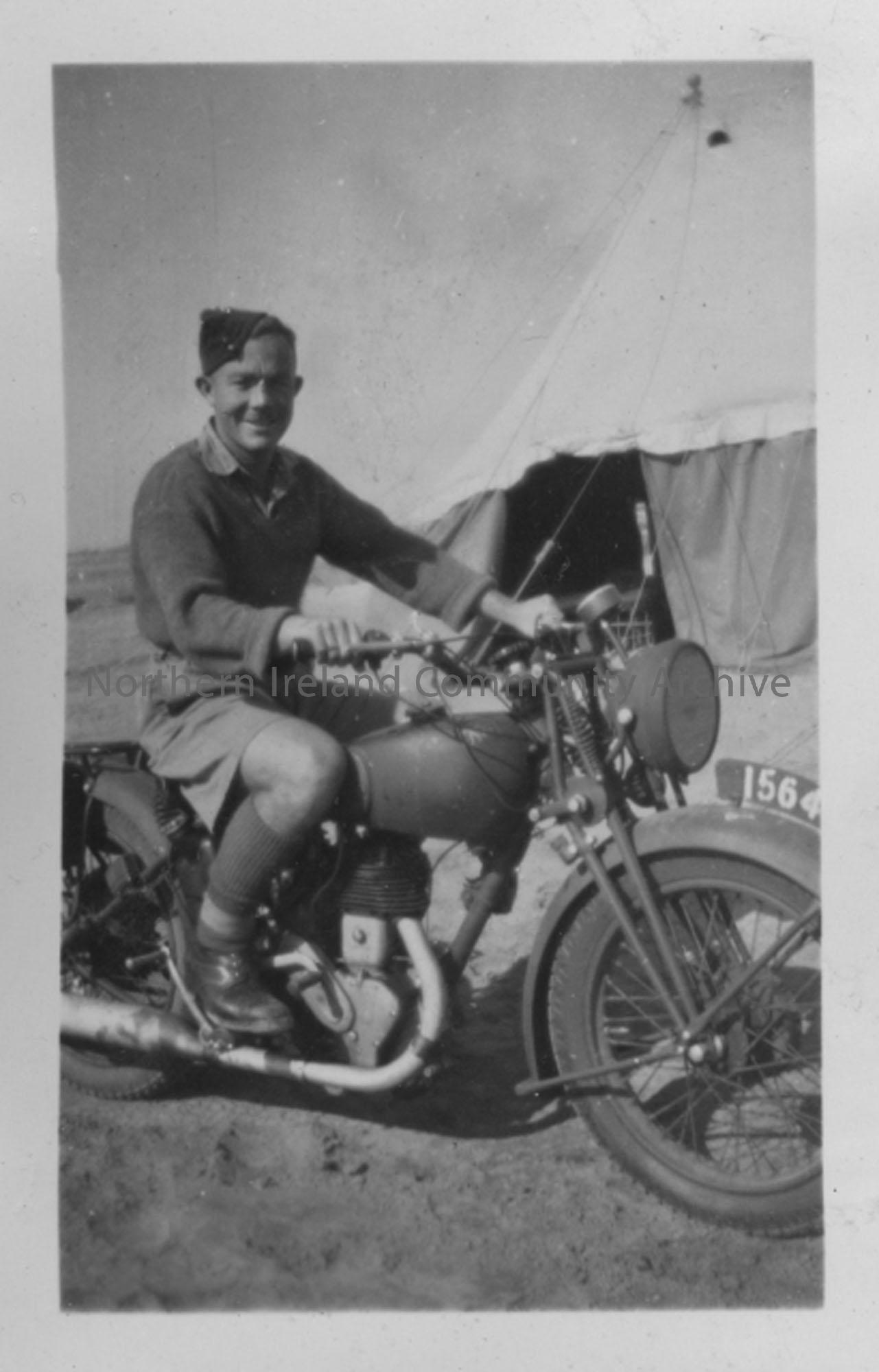 R McDonald on a BSA M20 500cc motorbike outside his accommodation marquee on Suez Canal AA duties.