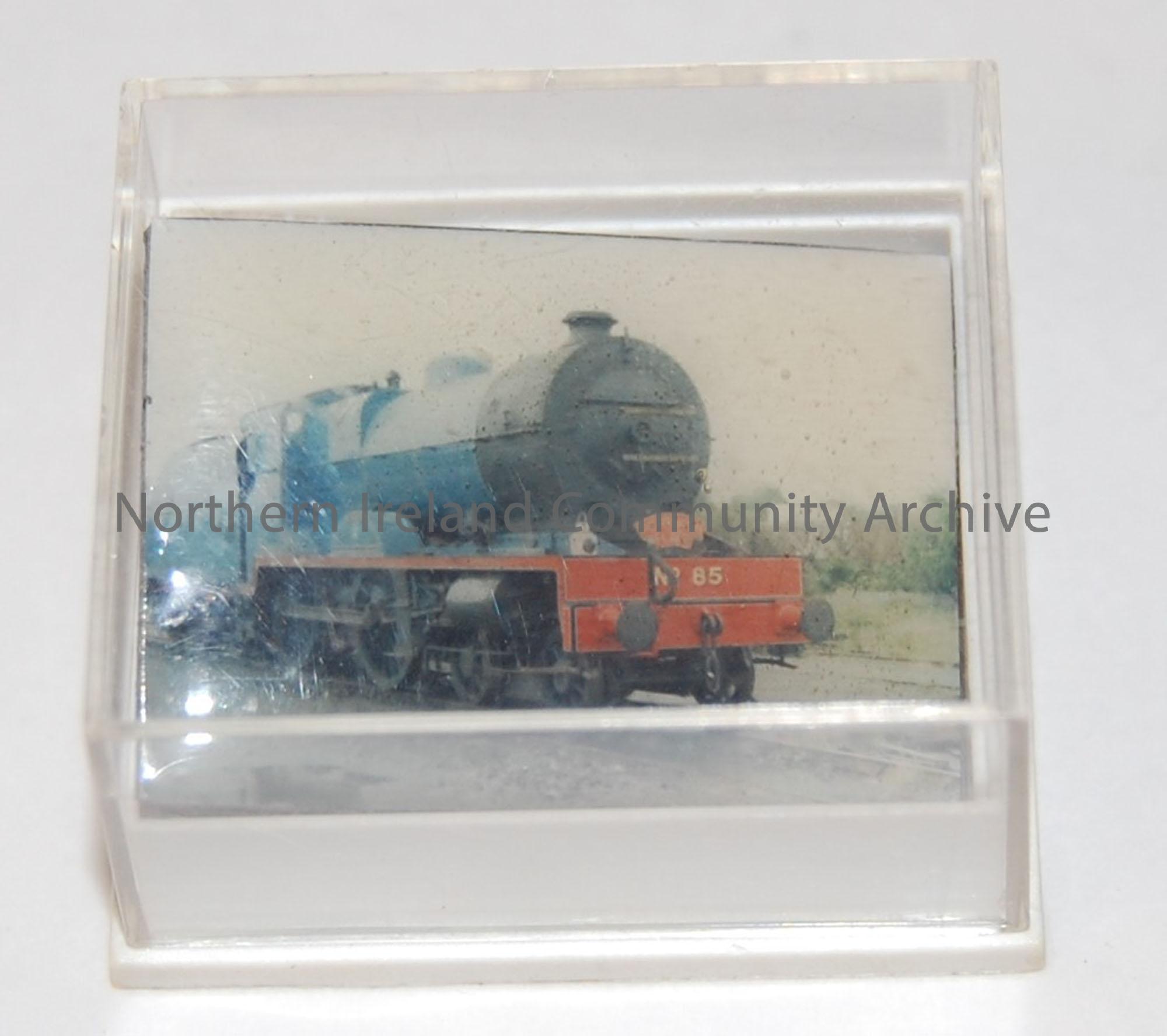 Railway badge commemorating the 150th Anniversary of the Ulster Railway. Colour photograph of a blue engine. In plastic box, with label on bottom