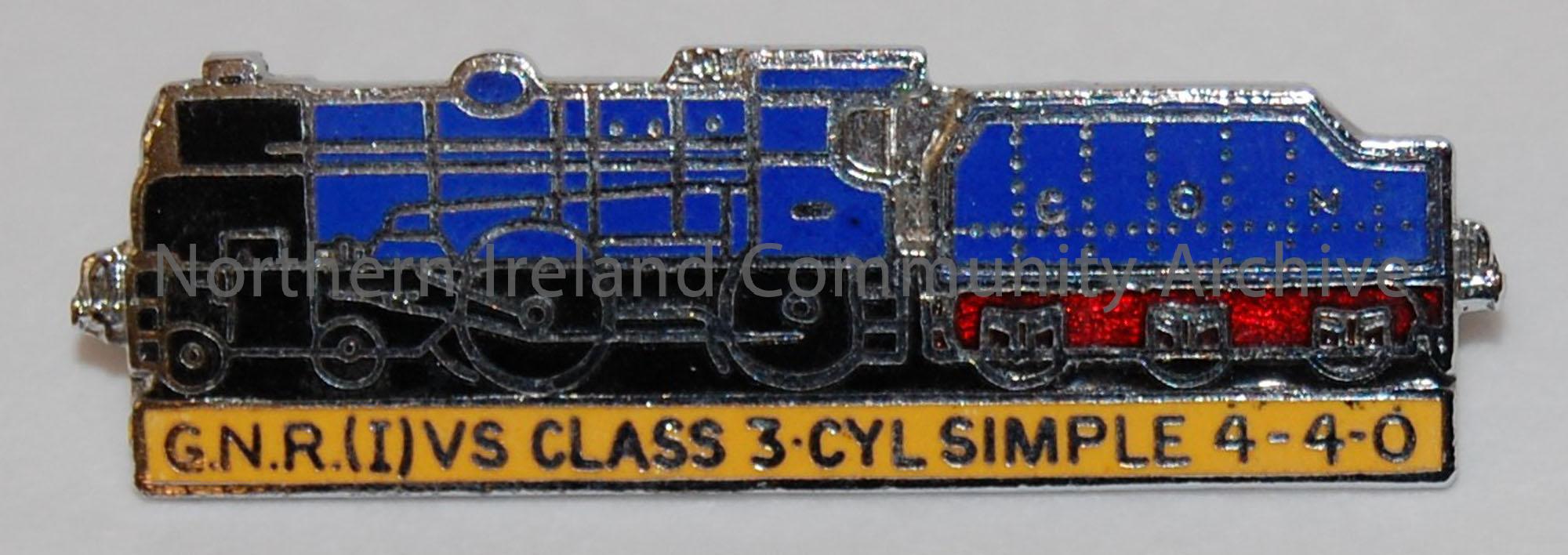Railway badge, G.N.R. Engine. Badge is in the shape of the engine. Blue/black/yellow/red enamel on silver backing