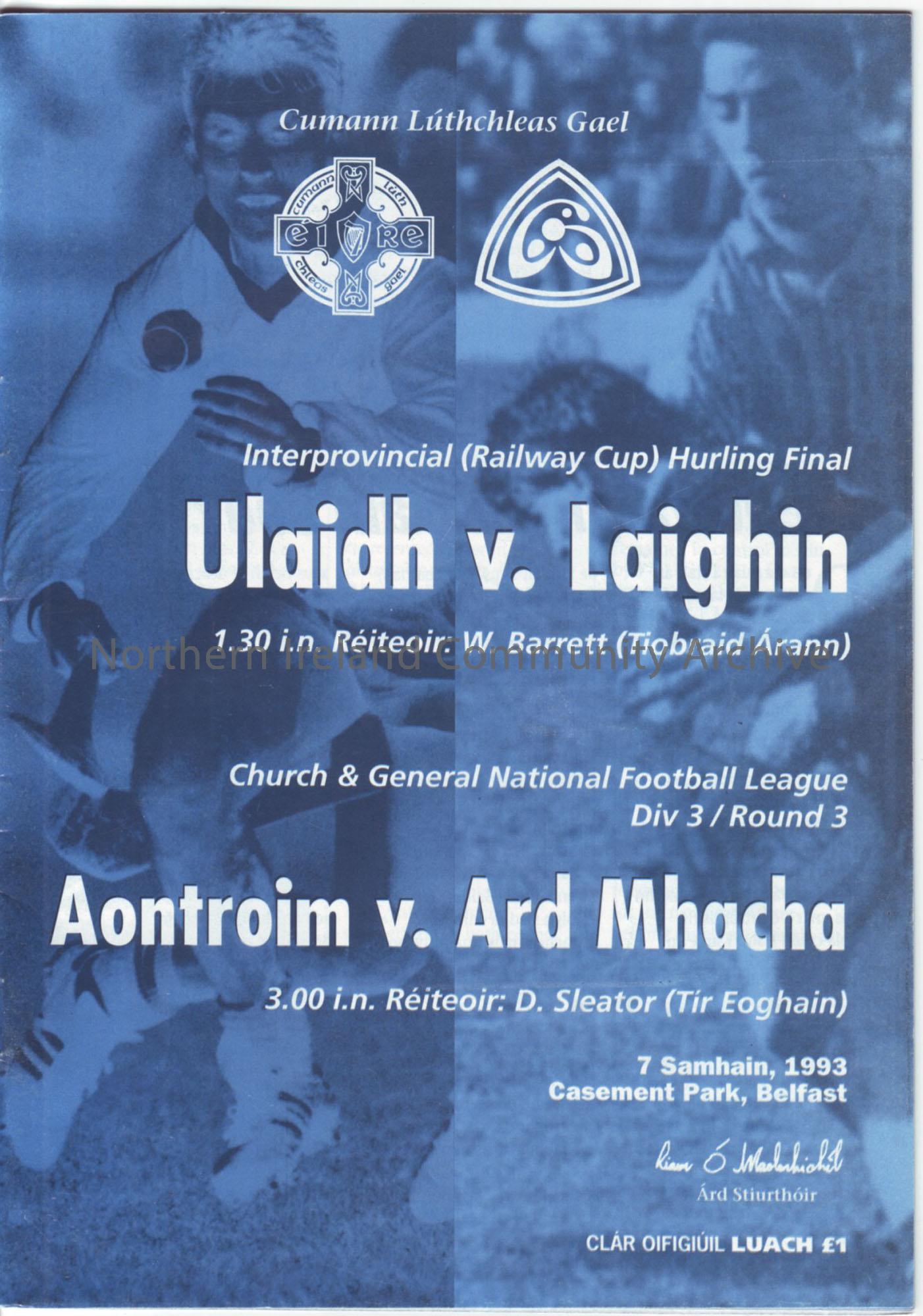 Railway Cup Hurling Final. Ulster v Leinster and National Football League Division 3 Antrim v Armagh at Casement Park. 7th November 1993