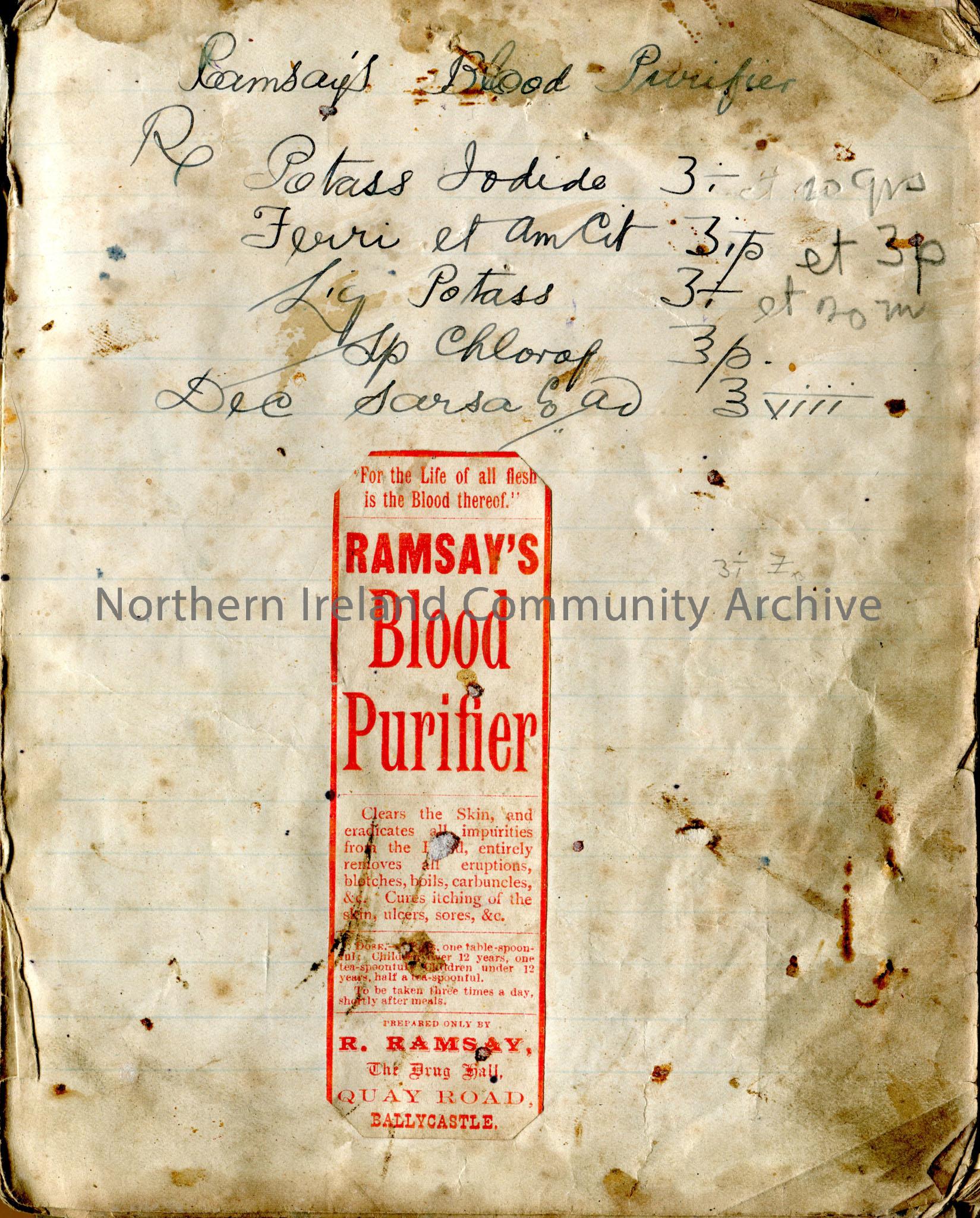 Ramsay's remedies, handwritten notebook with some advertised remedies as clippings tipped in. Quay Rd Ballycastle
