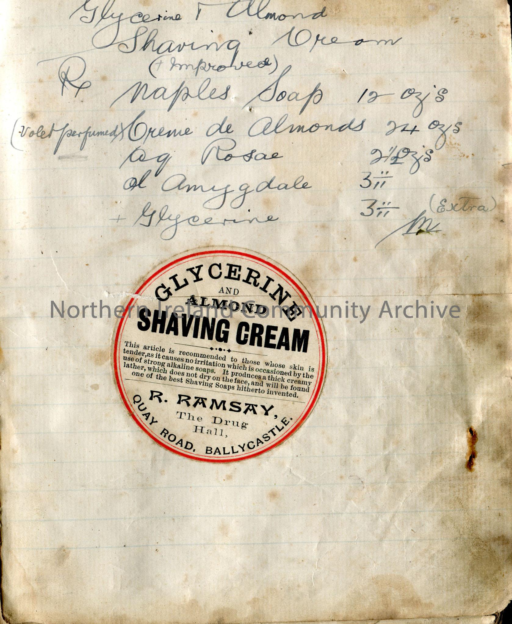 Ramsay's remedies, handwritten notebook with some advertised remedies as clippings tipped in. Quay Rd Ballycastle