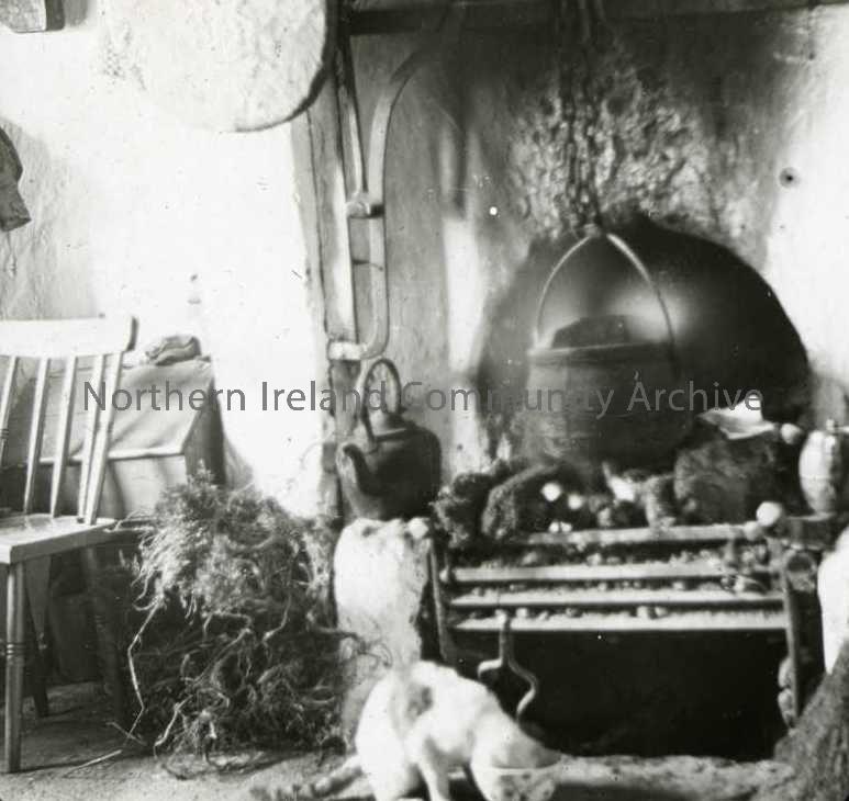 Open hearth scene in kitchen, with cat in front of fire - Rathlin