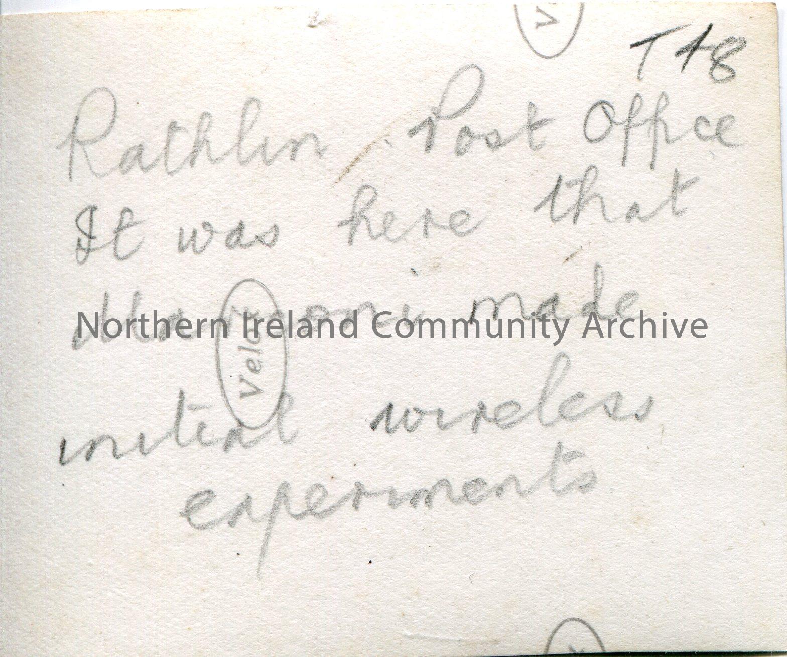 Rathlin Post Office as taken from the sea. ‘It was here that Marconi made initial wireless experiments’ handwritten on reverse. – T48b