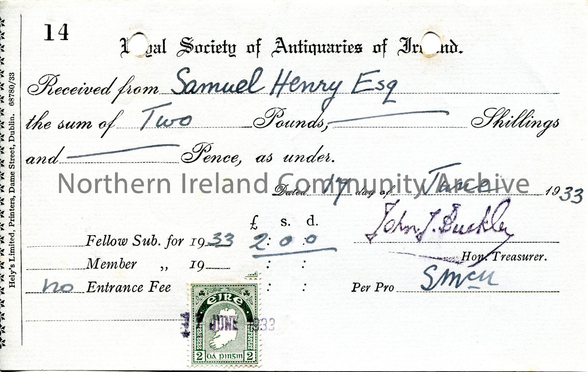 Receipt acknowledging payment from Sam Henry for annual membership to the Royal Society of Antiquaries of Ireland. Sum of £2. Signed by John Buckley, Hon. Treasurer. Dated 17th June 1933. Eire postage stamp pasted to receipt.