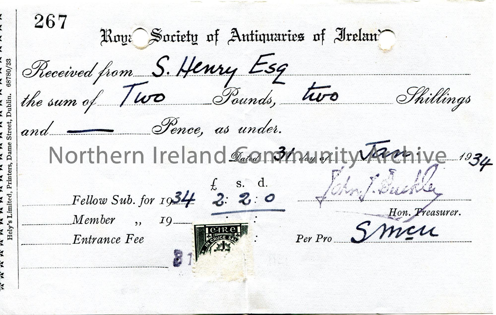Receipt acknowledging payment from Sam Henry for annual membership to the Royal Society of Antiquaries of Ireland. Sum of £2.2.0. Signed by John Buckley, Hon. Treasurer. Dated 31st January 1934. Eire postage stamp pasted to receipt [partially removed].