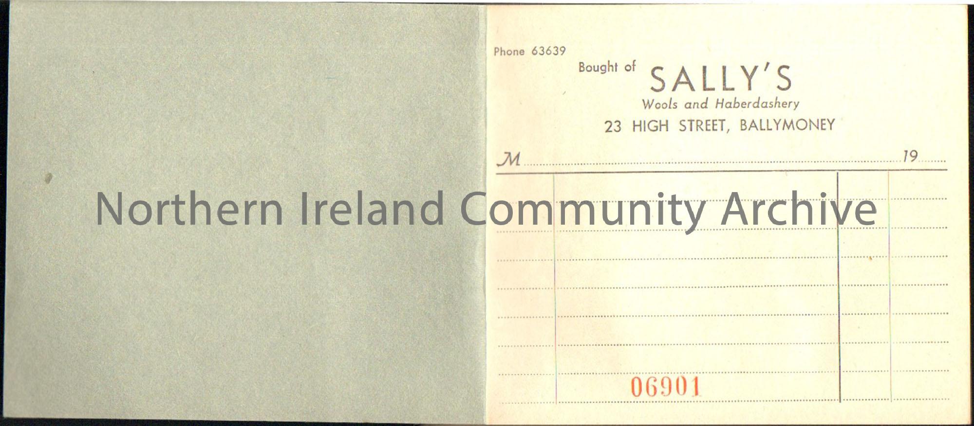 Receipt book from Sally’s Wools and Haberdashery with alternate pages marked out. First number is 06901. Blue cover