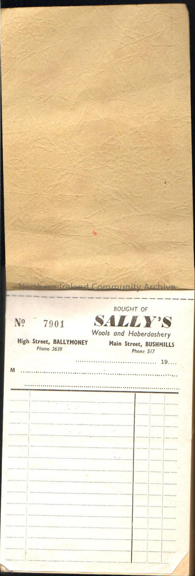 Receipt book with carbon duplicate pages from Sally’s Wools and Haberdashery with alternate pages marked out. First number is 7901. Cream cover