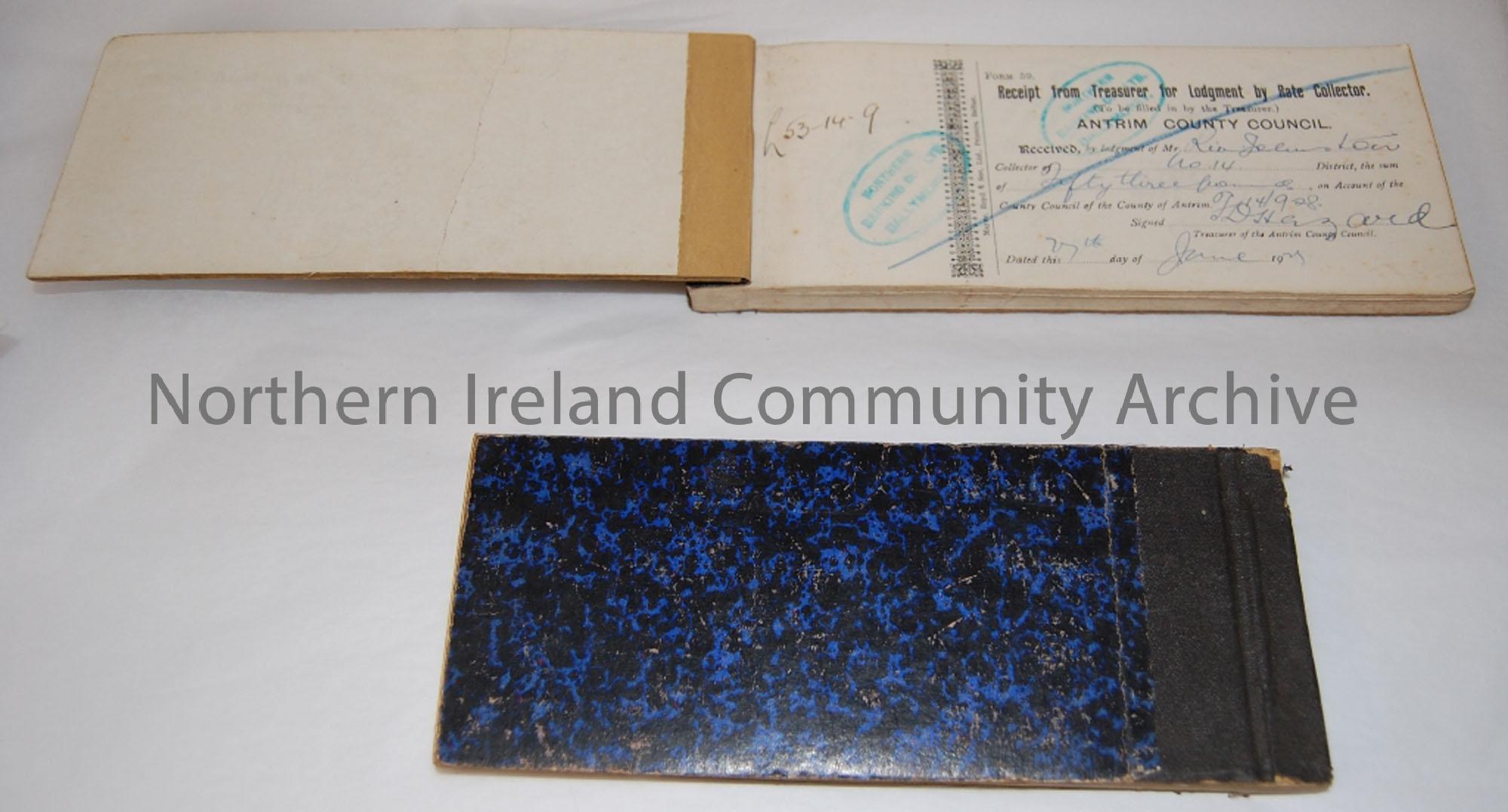 Receipt books from Treasurer for lodgement by Rate collector, Antrim County Council, Stamped Northern Banking Co. LTD, Ballymoney 1925&1927