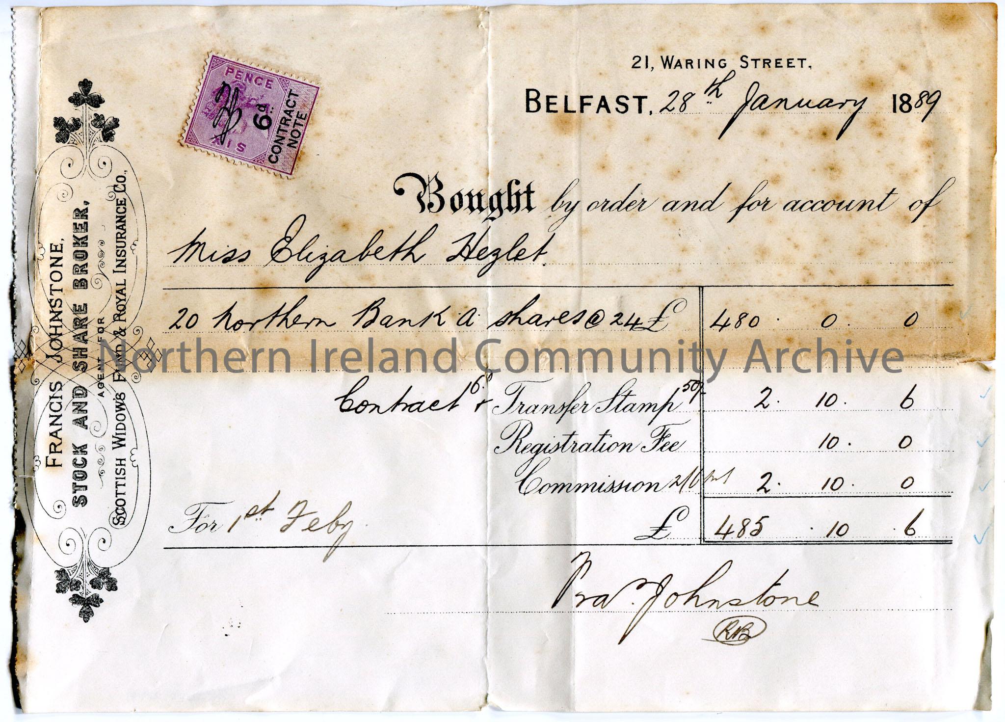 Receipt for purchase of shares bought by order and for account of Miss Elizabeth Hezlet. Purchase of 20 Northern Bank shares at £24 each. Total on receipt amounts to £485.10.6. Receipt printed on Francis Johnstone, Stock and Share Broker, Agent for Scottish Widows Fund & Royal Insurance Co. Addressed from 21 Waring Street, Belfast. Dated 28th January, 1889. Signed Johnstone. Purple 6d 'contract note' stamp of Queen Victoria.