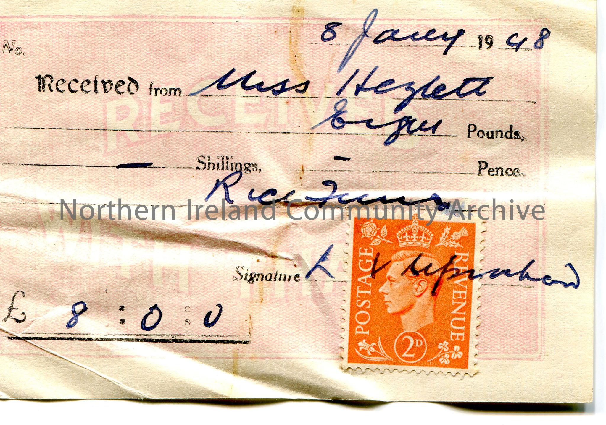Receipt from L.V.Uprichard to Miss Hezlet for the sum of eight pounds. Dated 8th January, 1948. Red George VI 2d stamp.