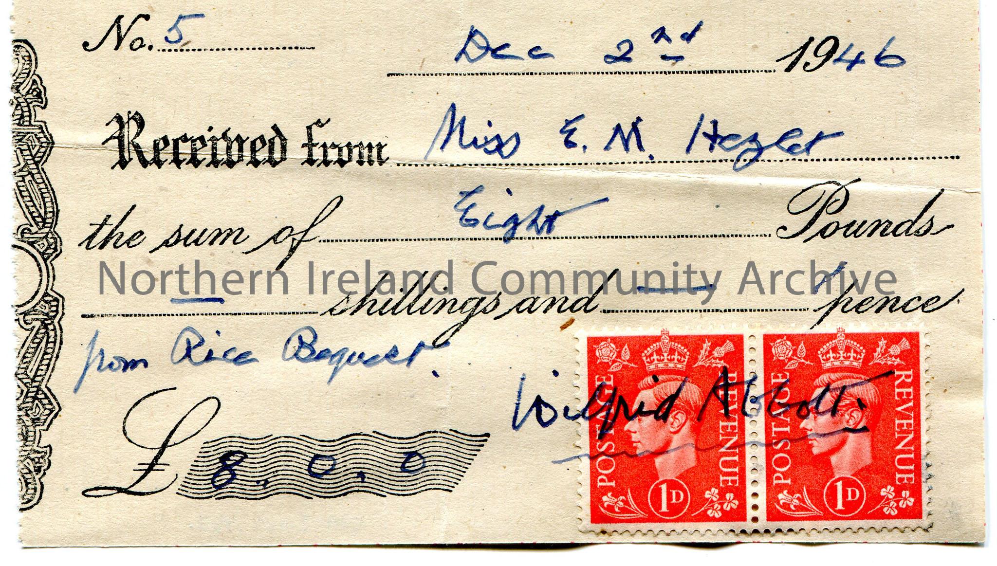 Receipt from Wilfrid Abbott to Miss E.M.Hezlet for £8.0.0 from the Rice Bequest. Dated 2nd December, 1946. Two red 1d George VI stamps.