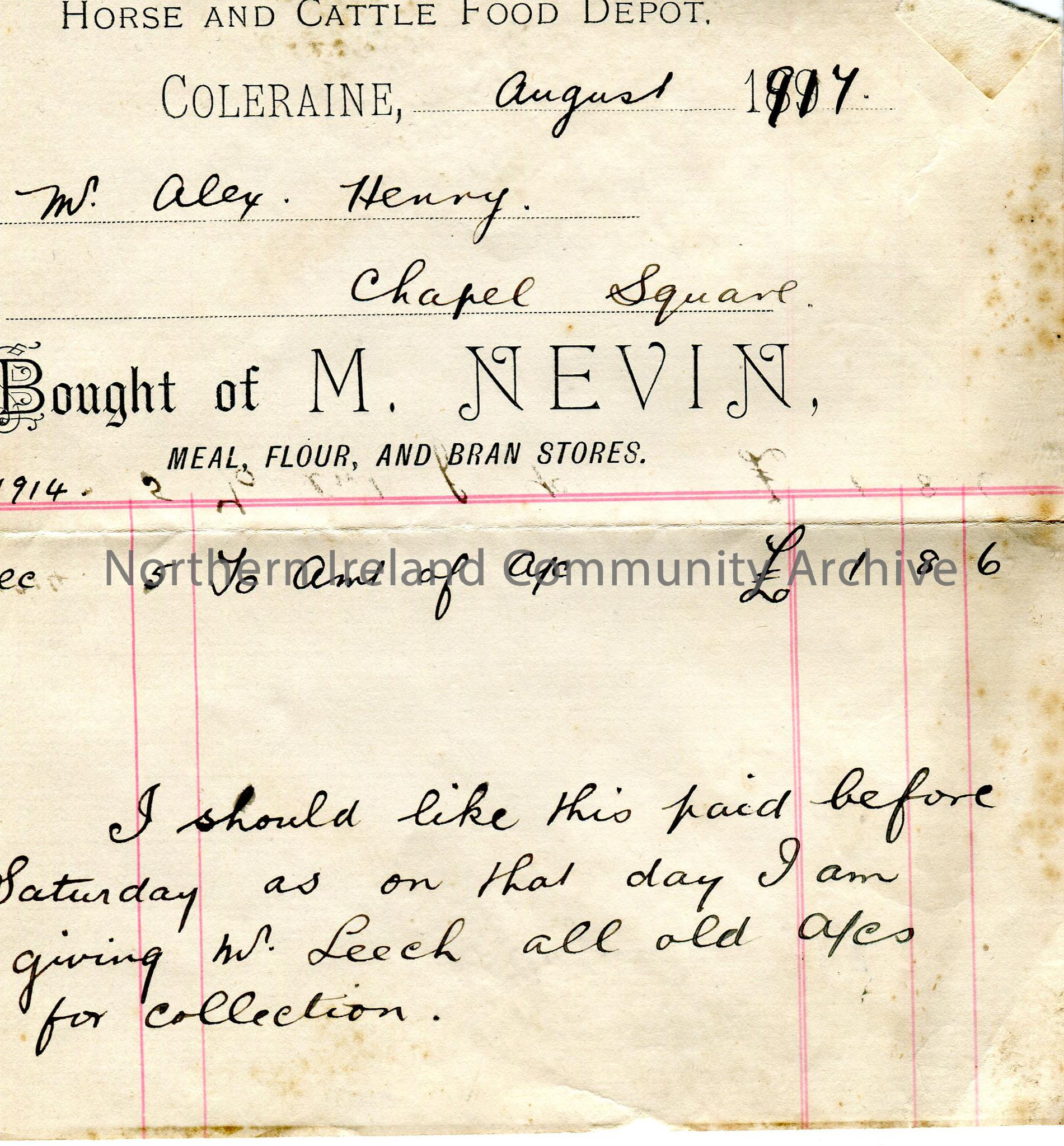 Receipt on headed paper for goods received, with a handwritten note asking for payment before handover to Leech [lawyer]
