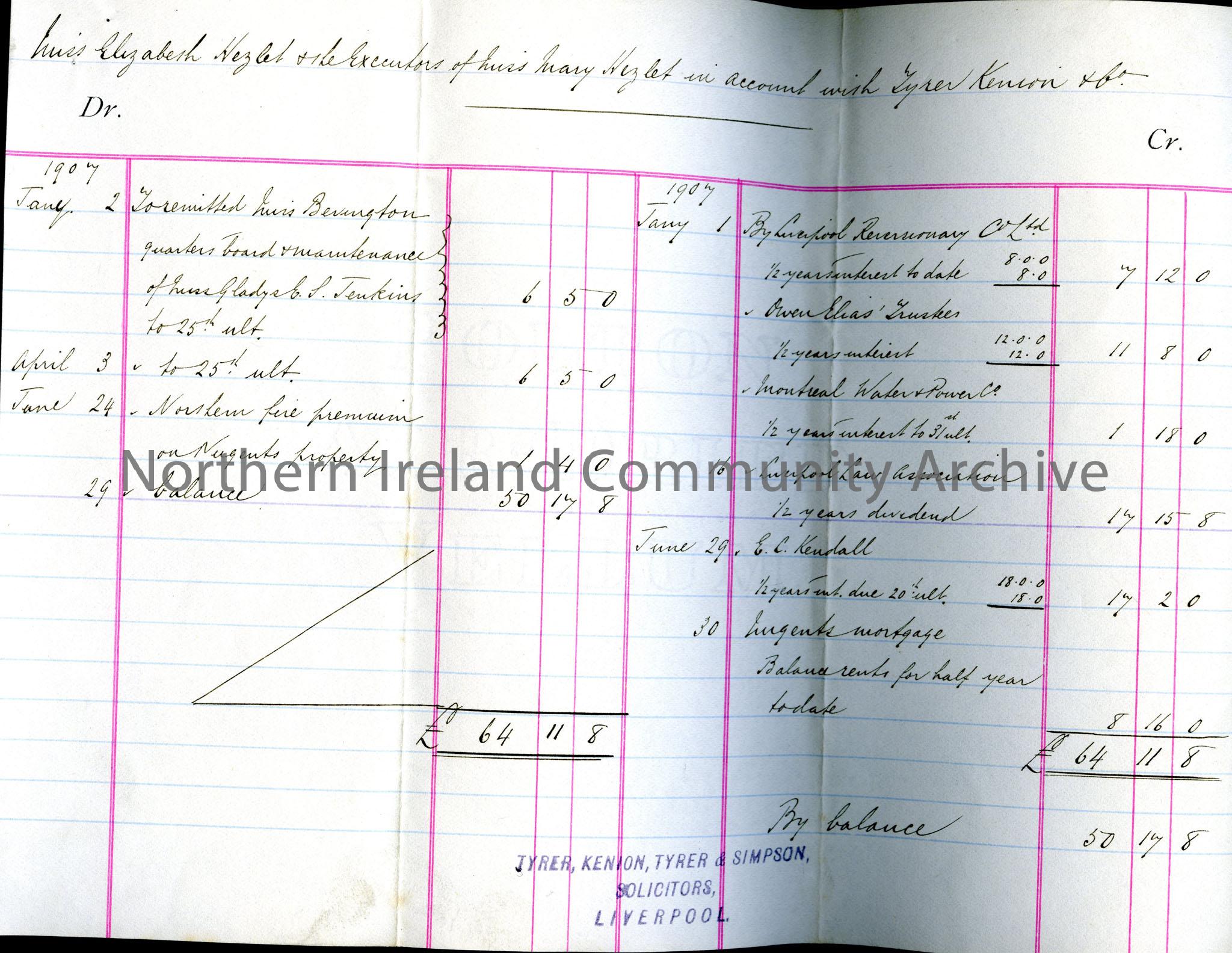 Record of accounts (handwritten) for 'Miss Elizabeth Hezlet and the Executors of Miss Mary Hezlet',Tyrer, Kenion and Co. Half yearly statement, January to June 1907. Handwritten sums on reverse, in pencil.