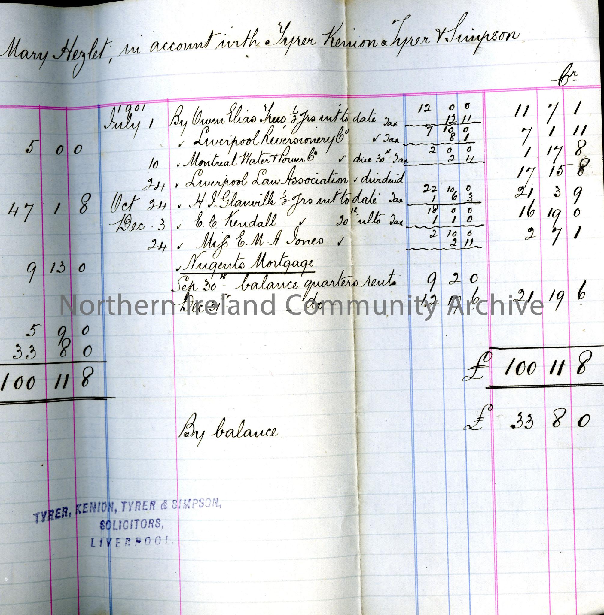 Record of accounts (handwritten) for 'Miss Elizabeth Hezlet and the Executors of Miss Mary Hezlet',Tyrer, Kenion and Co. Half yearly statement, July to December 1901.