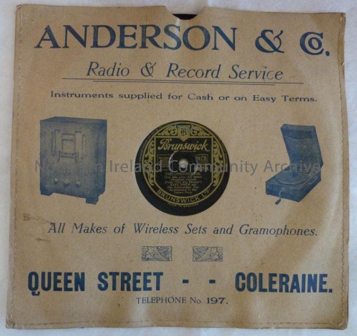 Record sleeve from Anderson & Co., Radio and Record Service. All makes of Wireless Sets and Gramaphones. Queen Street, Coleraine. Contained CM:2011:102.1