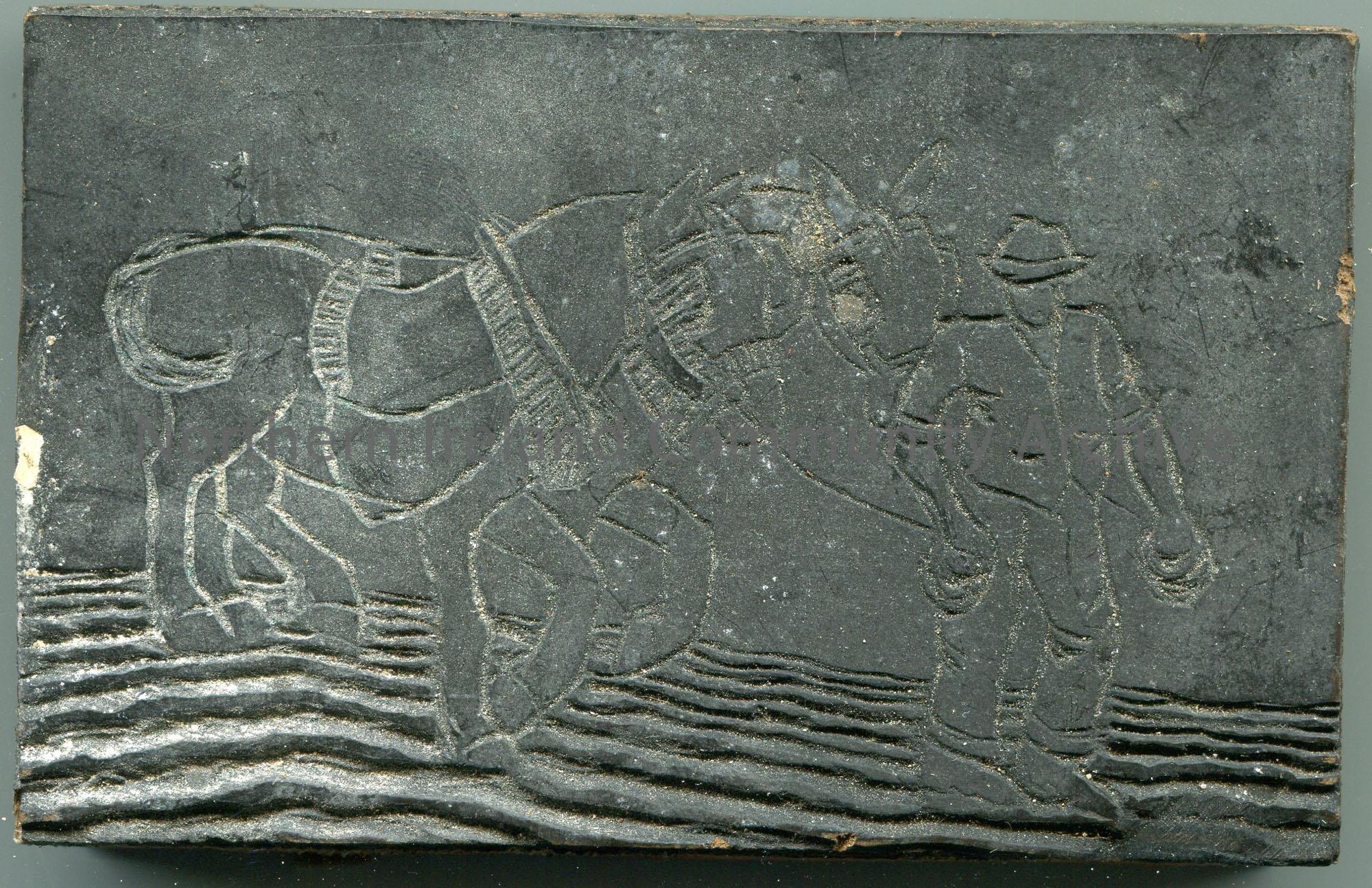 Rectangle shape linocut mounted onto a wooden block for printing. Image of a man leading two horses in a field. ‘Oct 1959’ handwritten on paper which …