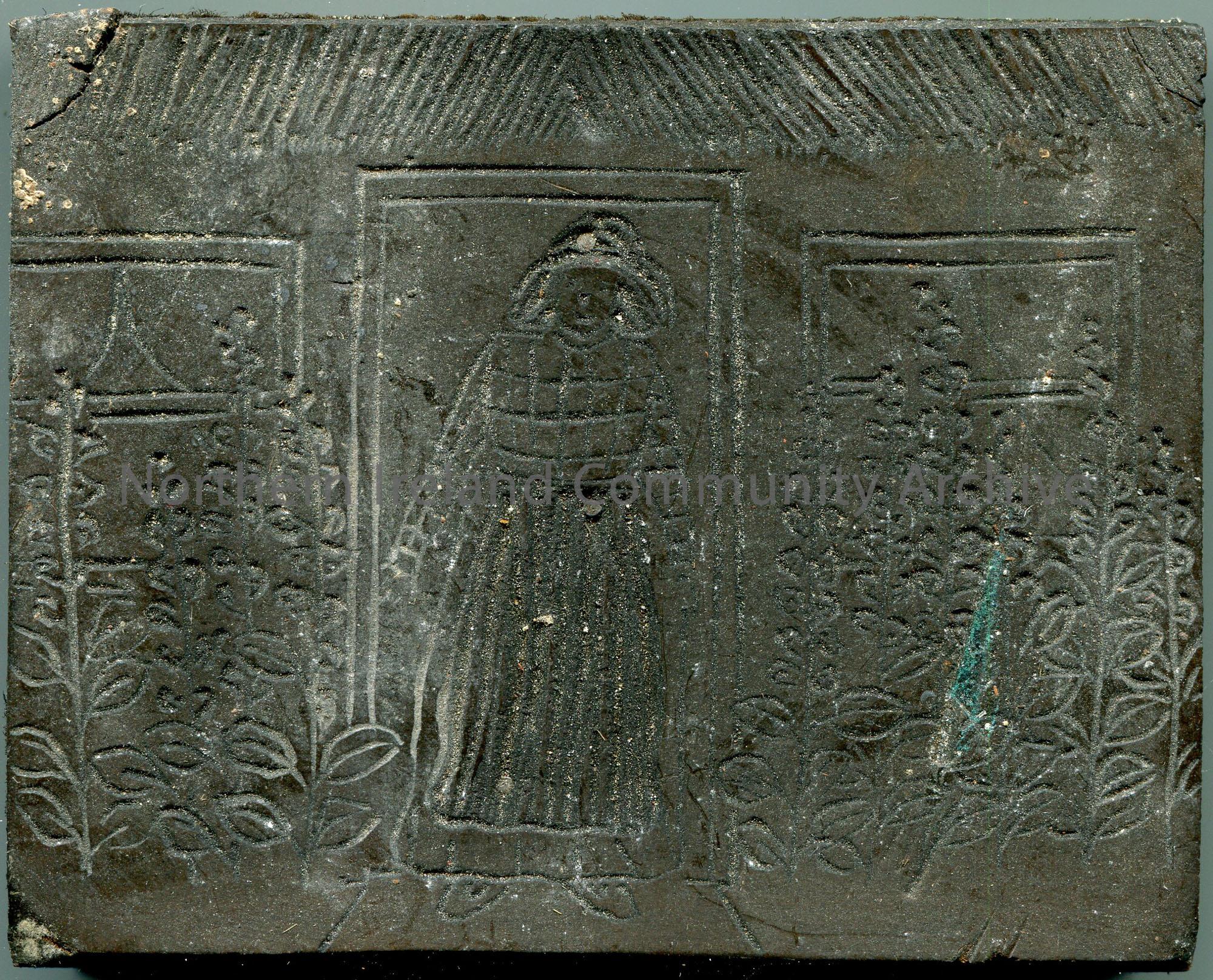 Rectangle shape linocut mounted onto a wooden block for printing. Image of a woman standing in a doorway. ‘Sept 1959’ handwritten in black Biro on cor…