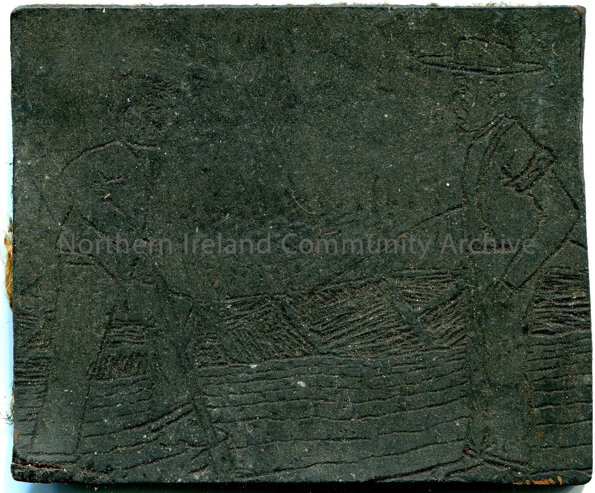 Rectangle shaped linocut with red/brown coloured backing. Reverse image of two men in a field. One is digging and the other is ploughing.