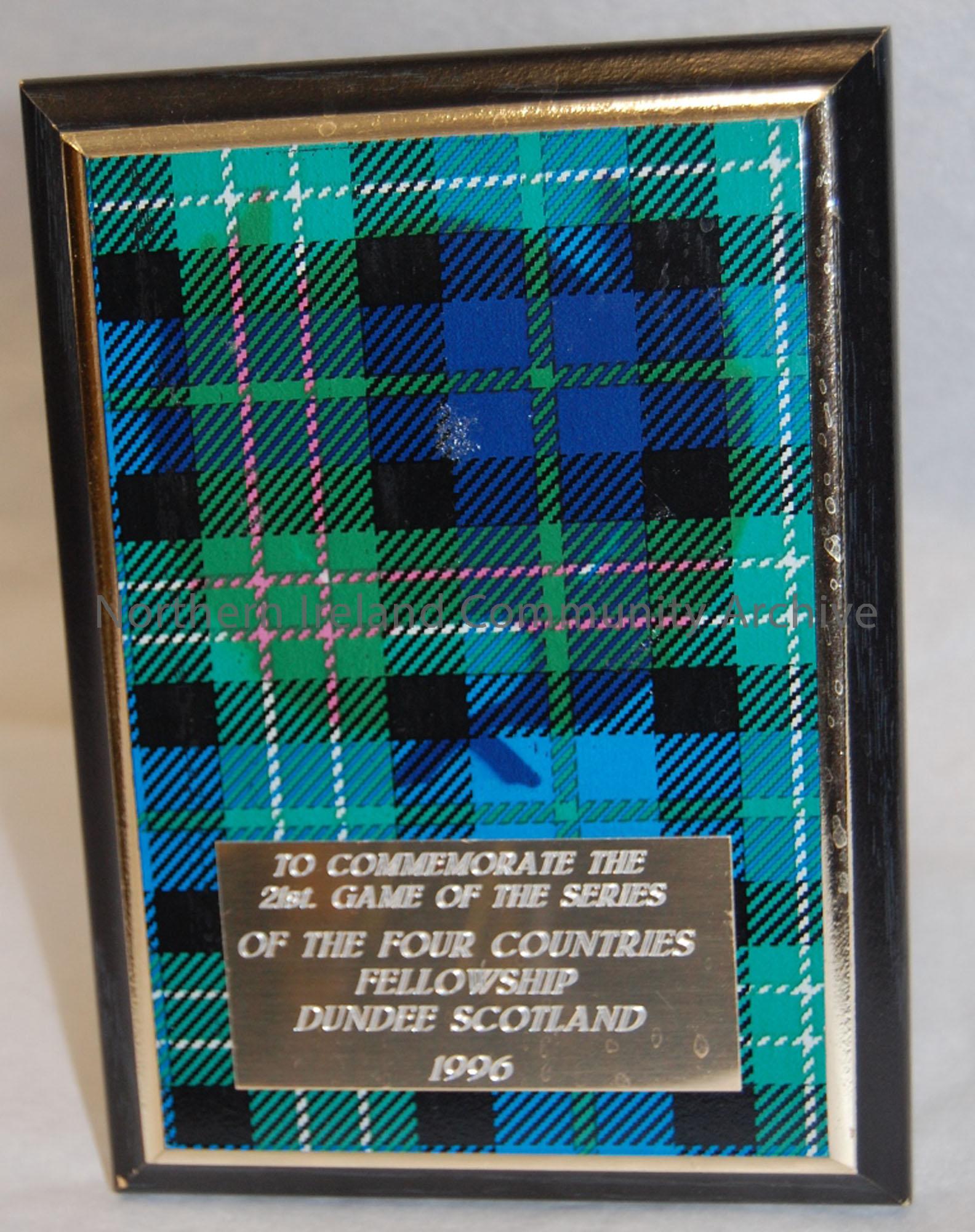 Rectangle shaped plaque with a green tartan pattern ‘To commemorate the 21st Game of the Series of the Four Countries Fellowship Dundee Scotland 1996.