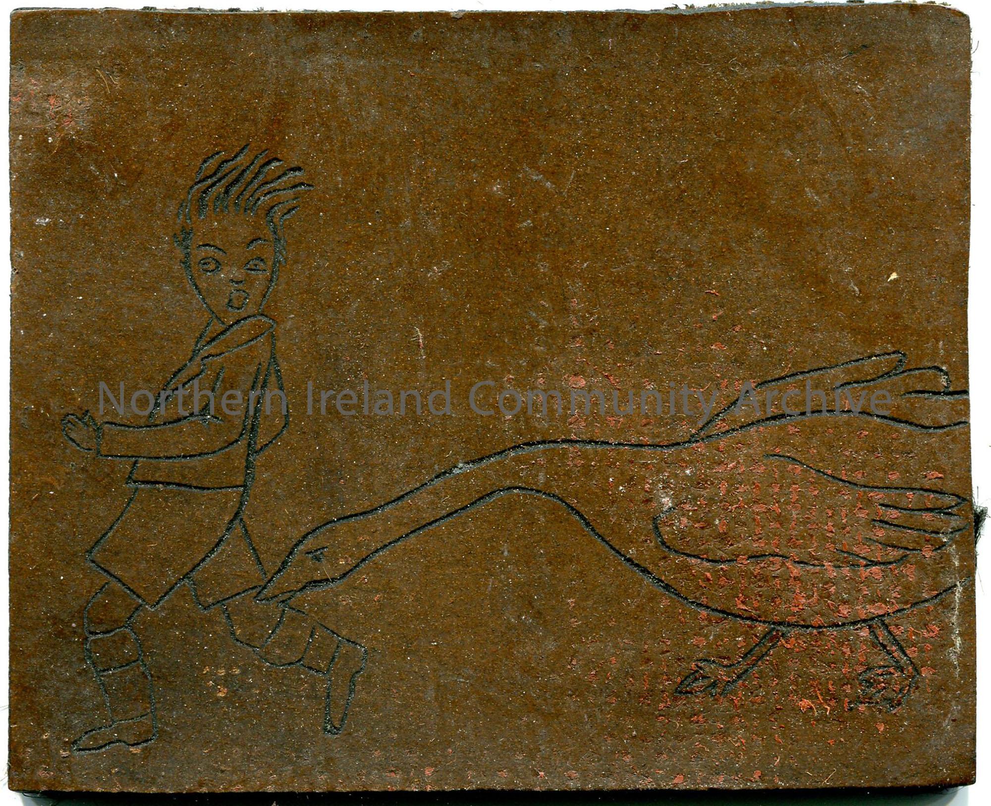 Rectangular shaped linocut with red/brown colour backing. Reverse image of a boy being chased by a swan.
