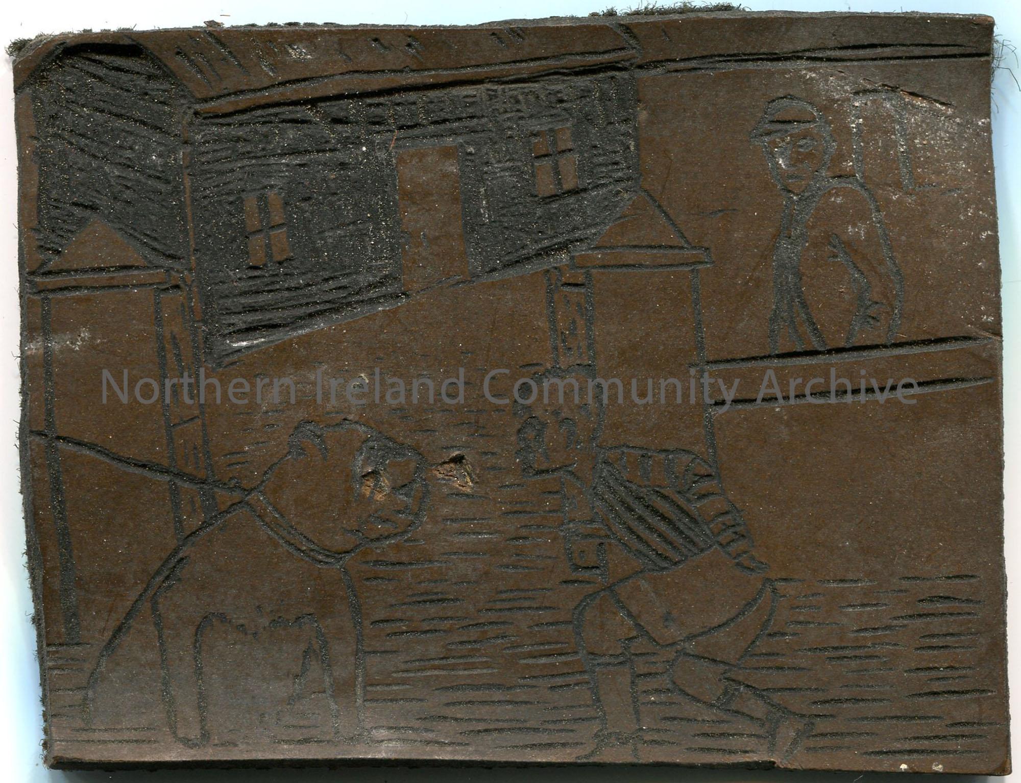 Rectangular shaped linocut with red/brown colour backing. Reverse image of a boy taunting a dog which is tied up. A man in the background is looking a…