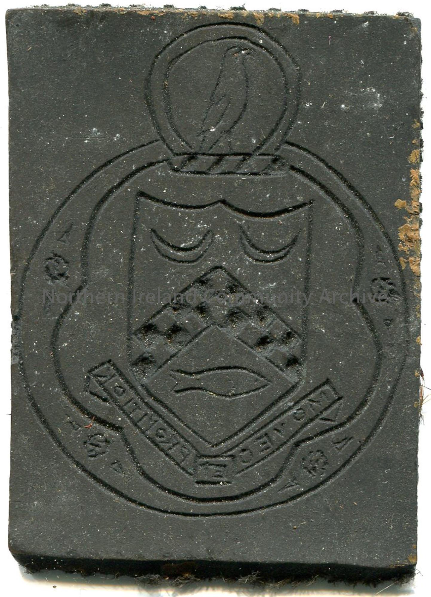 Rectangular shaped linocut with red/brown colour backing. Reverse image of a crest featuring a fish and a bird - Knox family Coat of Arms. Writing in reverse reads 'moveo et propitior' - [I progress and am appeased].